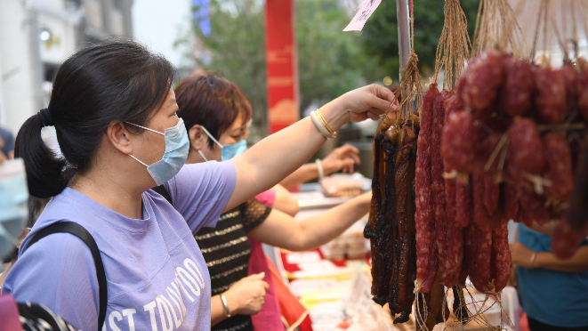 广州市民在购买广式腊味。(图片来源:新华社资料图)