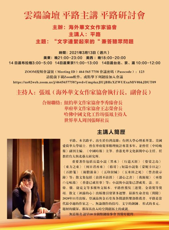 【本報訊】由《海外華文女作家協會》主辦,知名女作家平路主講,主題為“文字連繫起來的”雲端講座兼答聽眾問題,3月13日將通過zoom meeting軟件舉行,歡迎全球文學愛好者參加。