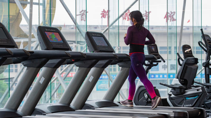 一位市民在北京市海淀区腾达大厦内的一家健身房内跑步锻炼。(图片来源:中新社资料图)