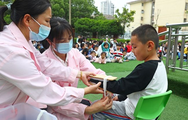 当机体遭受一定程度的物理性伤害或发生炎症时,受损处会释放出致痛物质。图为老师模拟为“受伤”幼儿手部进行包扎。(图片来源:中新社资料图)