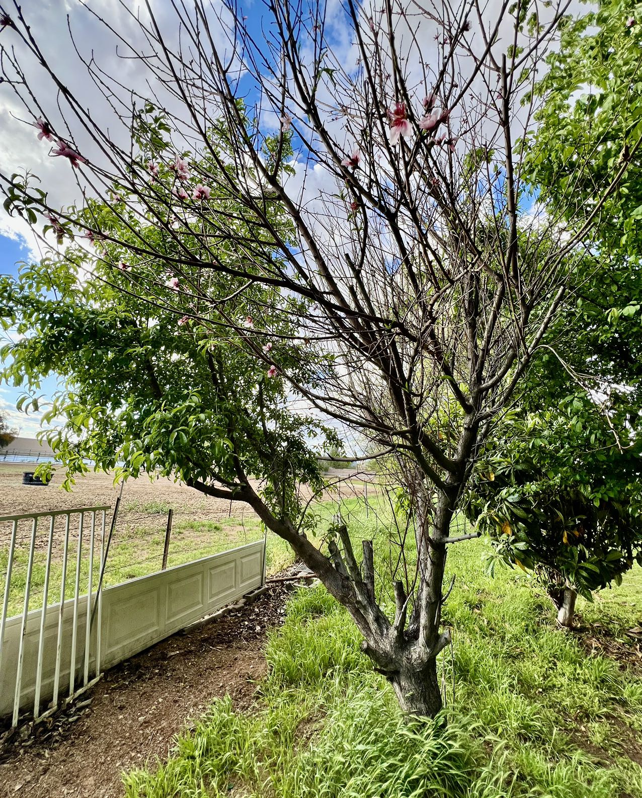 改造过的桃树,左边是几年前嫁接后长大的沙漠金桃,目前已经开完花正在结果。右边是原来的秋桃树,仔细看可以看到正在开的花。中间部分已经砍掉了,还可以看到砍剩下的树枝。