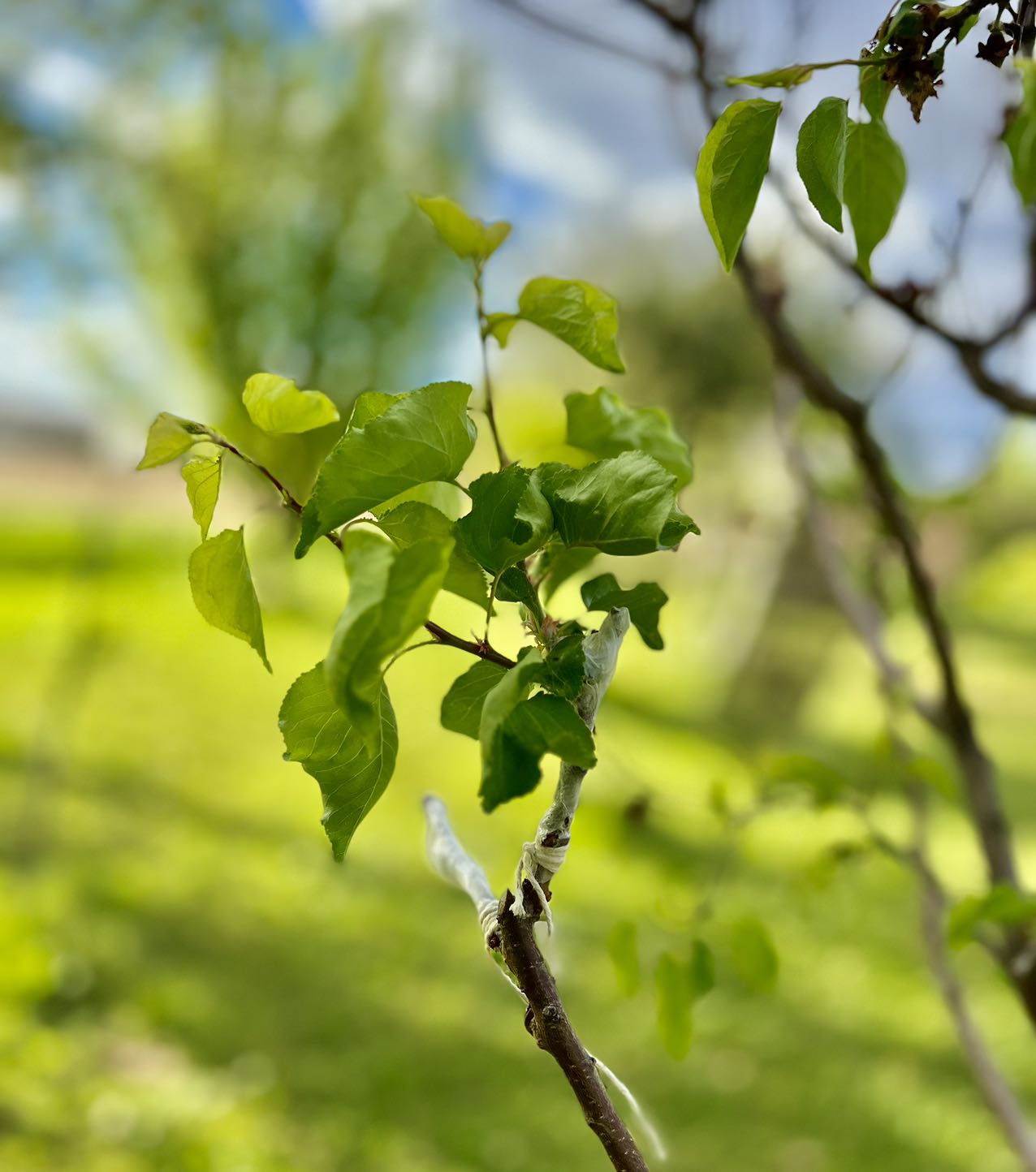 大概五年前我们还改造了一棵桃树。本来的桃子是秋天成熟,而且果实不多,也不太好吃。我们先在桃树的一边接上了春天成熟的沙漠金桃,然后过去几年,通过一步步地修剪,现在沙漠金桃已经超过半壁江山了。去年这半棵树上结了数不清的桃子。