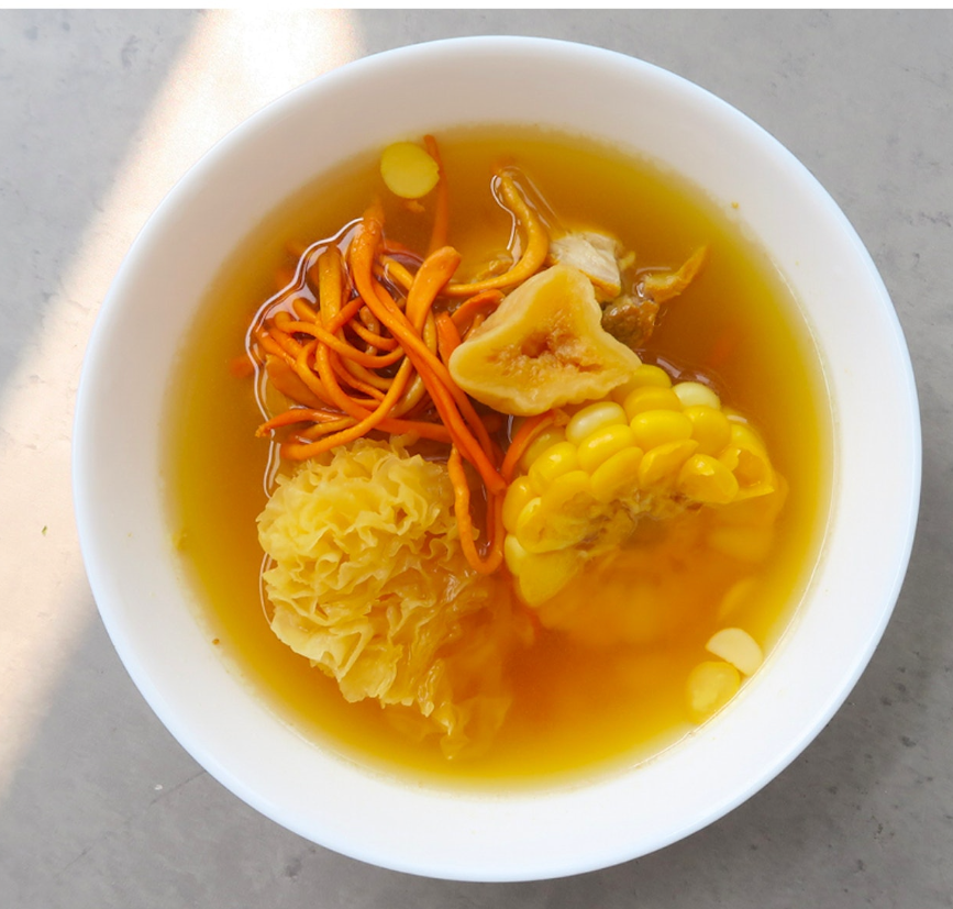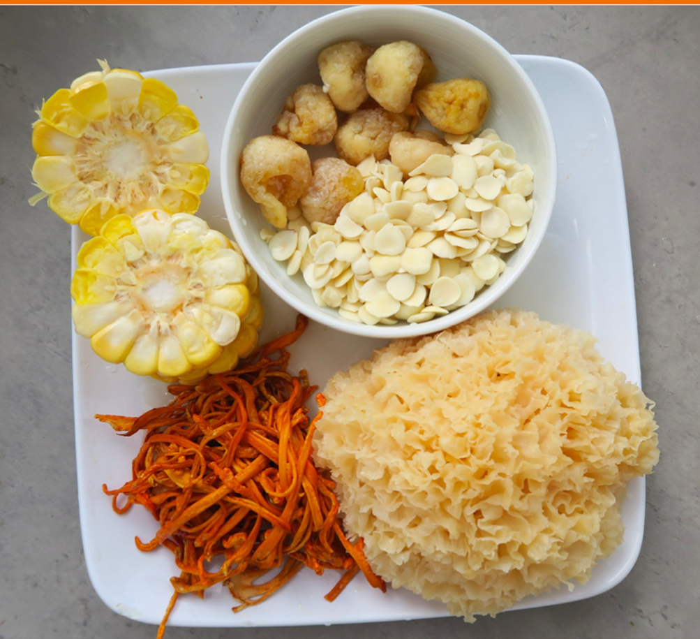 2.虫草花浸水10分钟;无花果及南北杏洗净;粟米洗净切件。