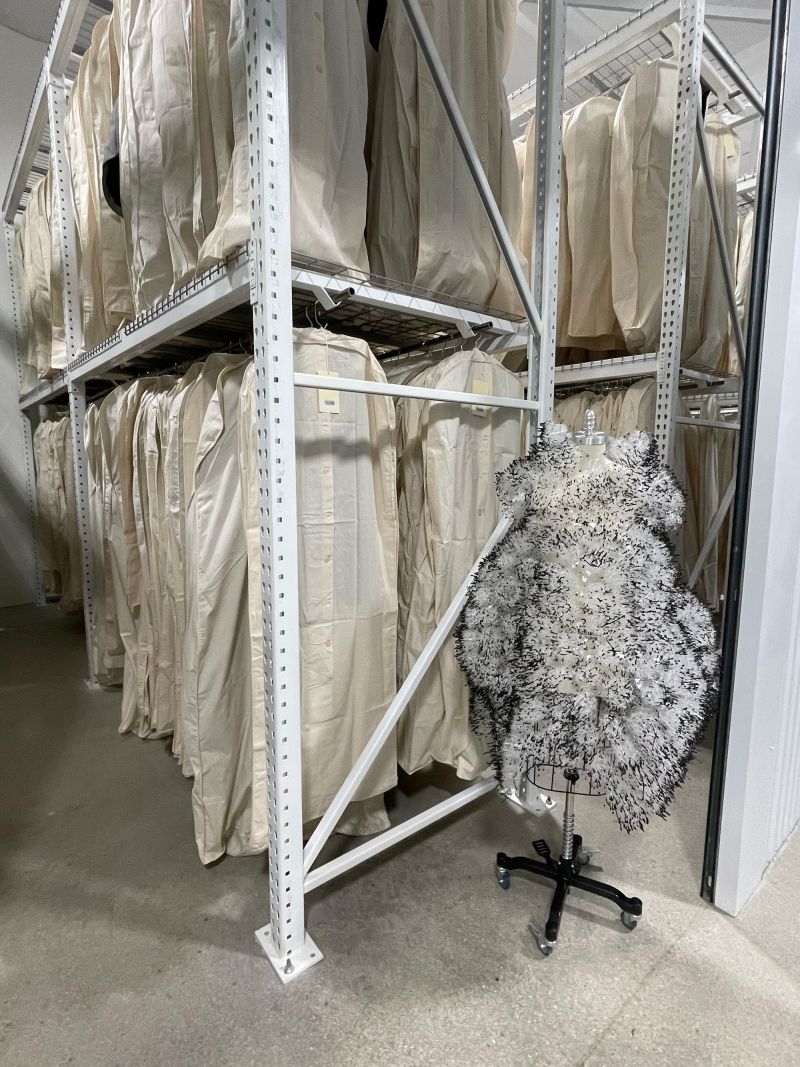 “每件具体物品的安装或存放方式都是个案研究,”她说。“所以有些东西是挂着的,有些东西是装箱的,有些东西必须安装起来,也就是说,它们要像人体模型一样被穿上,因为这些东西是设计用来穿的。它们并不是真正设计用来挂着或平放的。”