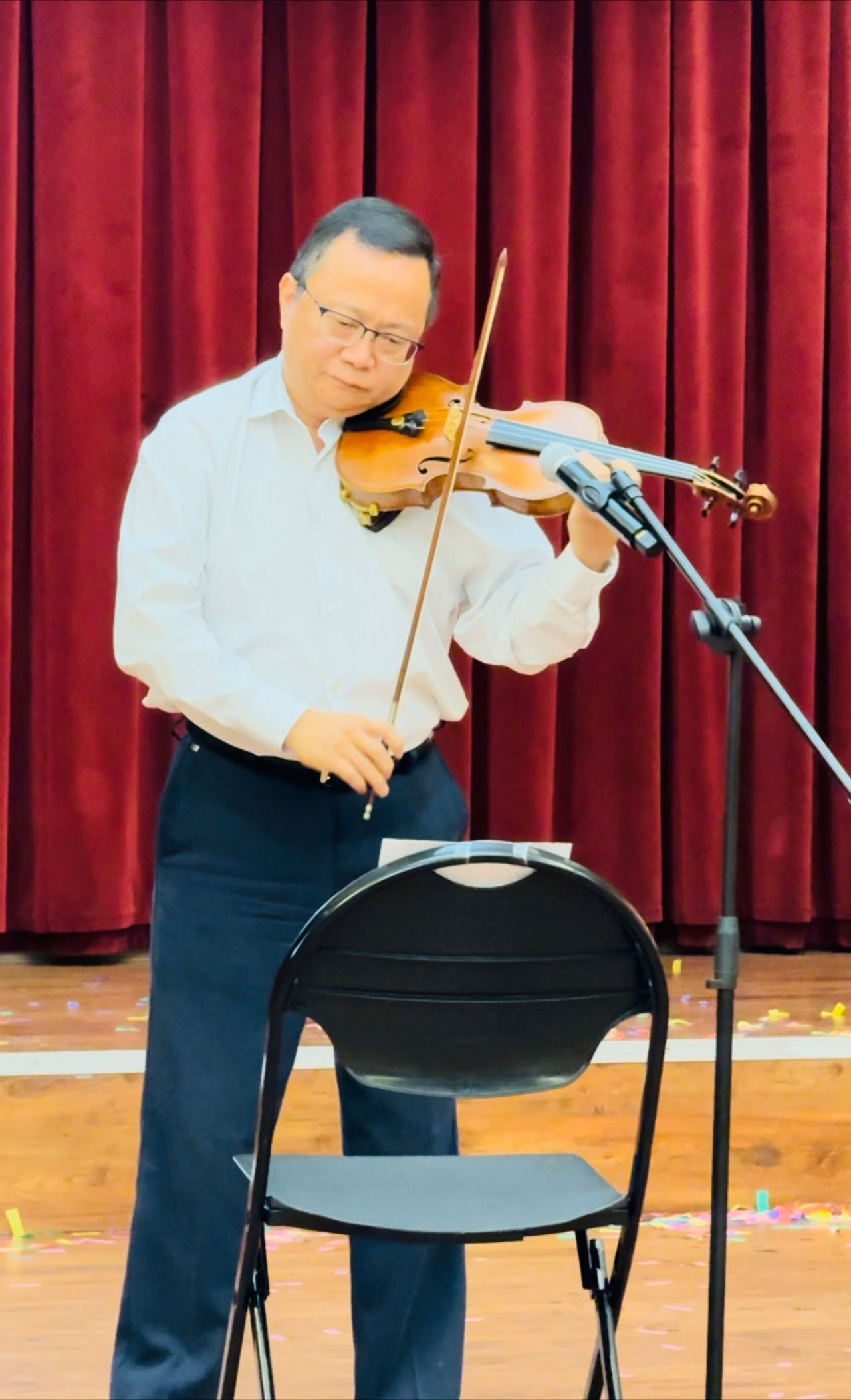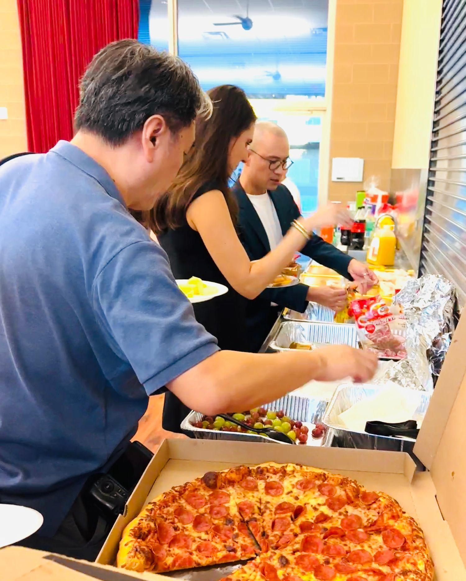 今年的晚会与往年不同,摆脱了往年演出者在台上唱歌跳舞,观众坐在大剧院中观看的固定形式。会场布置简洁大方,后面摆着一排桌子,桌子上摆满各式月饼、中式点心小吃、水果、饮料、PIZZA......大多是会长彭菲两口子在洛杉矶采购回来的,十几张观众桌子依次排开。晚会开始前,华联董事、义工帮忙将会场布置好,摆上精美的餐具、点心,与众同乐的氛围满满。