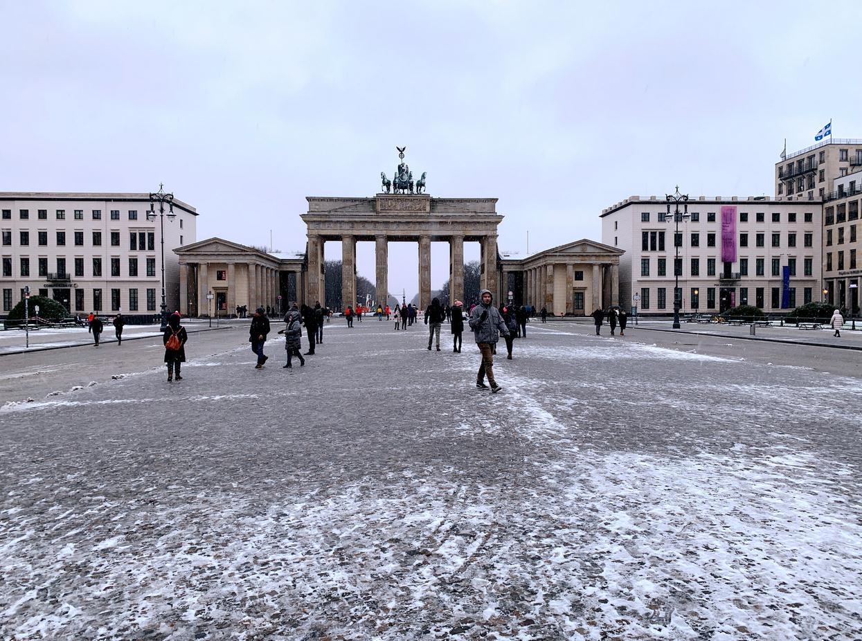 当地时间1月3日,德国柏林迎来2021年首场降雪。图为柏林勃兰登堡门前巴黎广场的地面出现积雪。