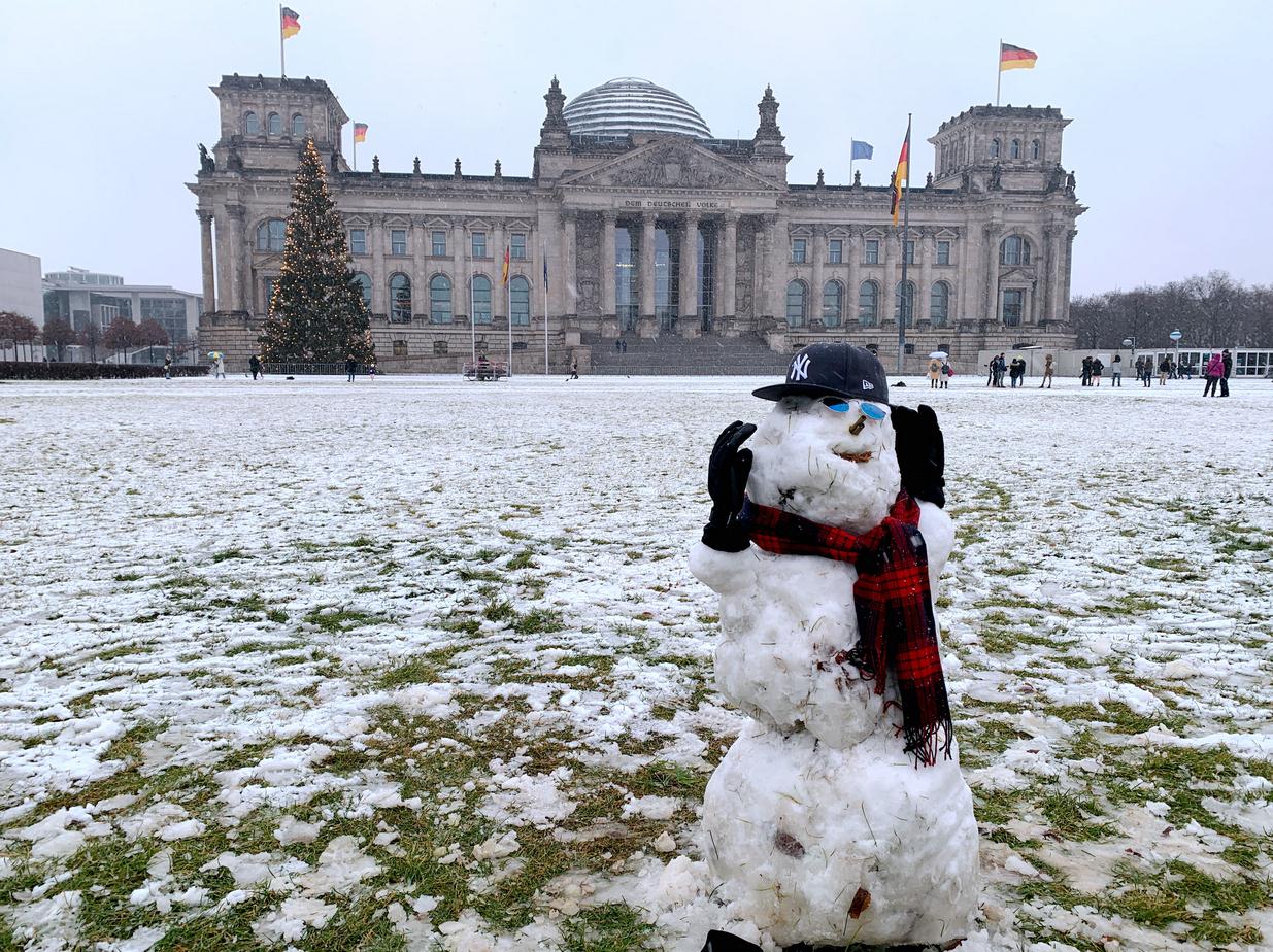 当地时间1月3日,德国柏林迎来2021年首场降雪。图为当天中午,柏林国会大厦前出现了一个雪人。