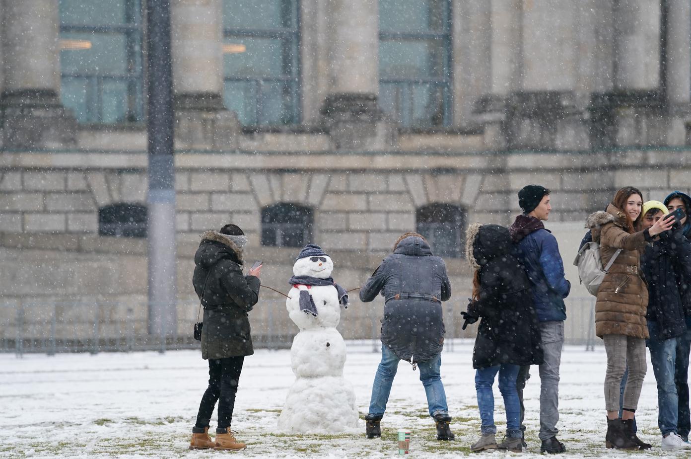 地时间1月3日,德国柏林迎来2021年首场降雪。图为当天中午,柏林德国国会大厦前的一个雪人吸引人们与之合影。