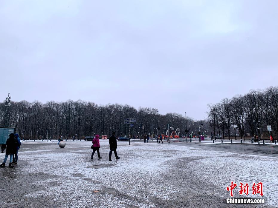 当地时间1月3日,德国柏林迎来2021年首场降雪。图为柏林蒂尔加滕公园前的积雪。