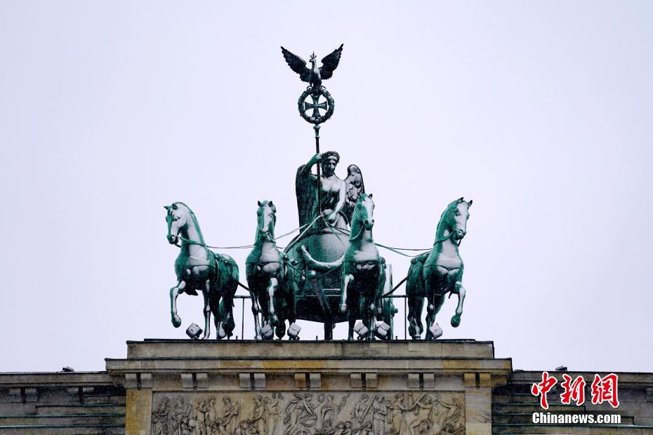 当地时间1月3日,德国柏林迎来2021年首场降雪。图为柏林地标建筑勃兰登堡门上方的雕像布满积雪。