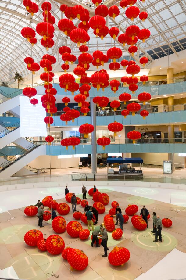 2月2日,在得克萨斯州达拉斯市加列里亚购物中心,200多只红灯笼高高挂起,为即将到来的新春营造出浓浓的节日氛围。