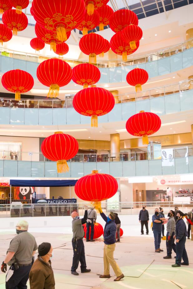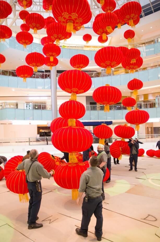 2日,在得克萨斯州达拉斯市加列里亚购物中心,工作人员悬挂红灯笼。