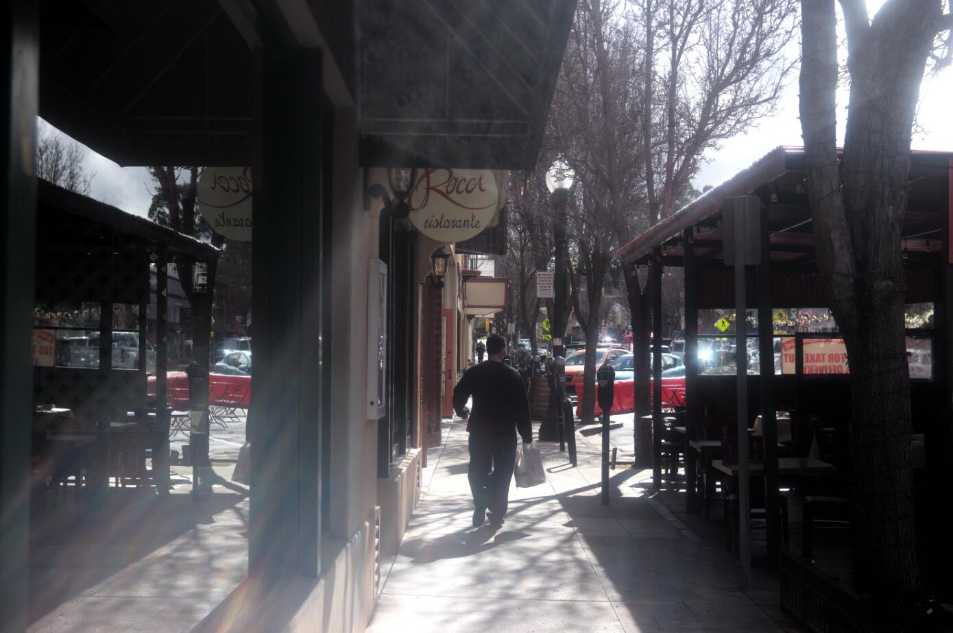 10日,人们走过加利福尼亚州北部小城伯灵格姆的百老汇大街。