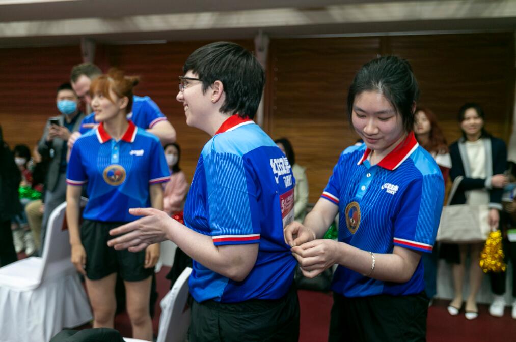 10日,中乒院学生吴依蔓(右)为美领馆副领事安辰雨贴号码布。(图片来源:新华社)