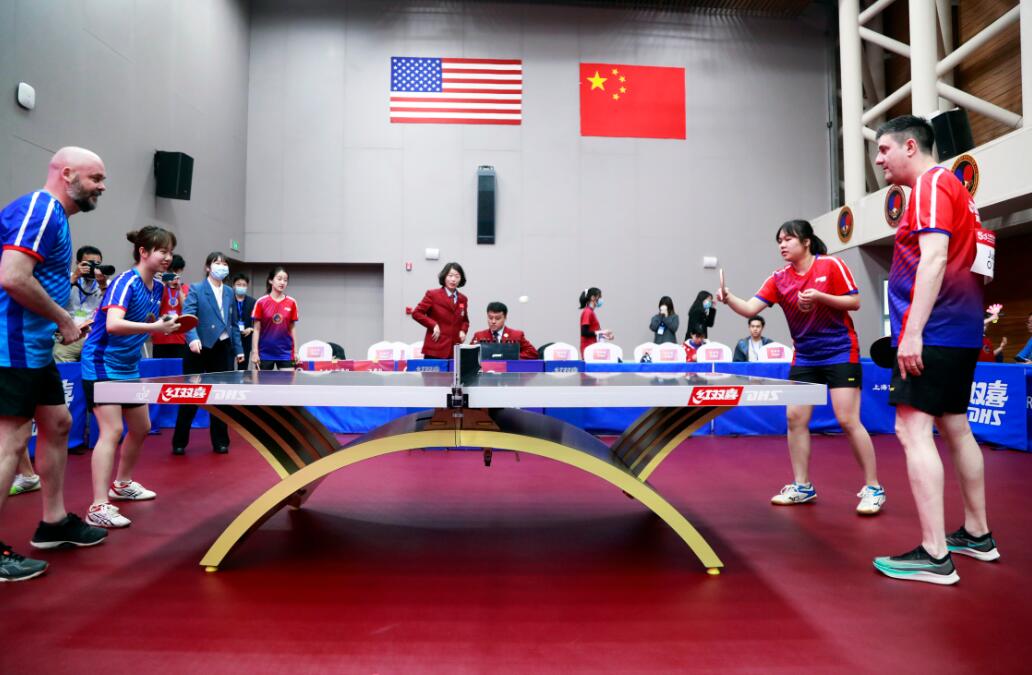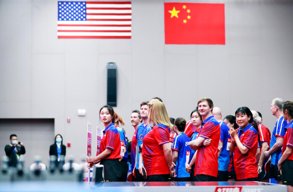 中美选手参加乒乓球友谊赛。 (图片来源:中新社)