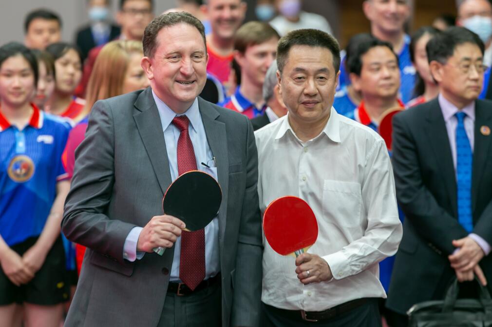 10日,国际乒乓球联合会副主席施之皓(前右)和美国驻上海总领事馆总领事何乐进(前左)在开球后合影。(图片来源:新华社)