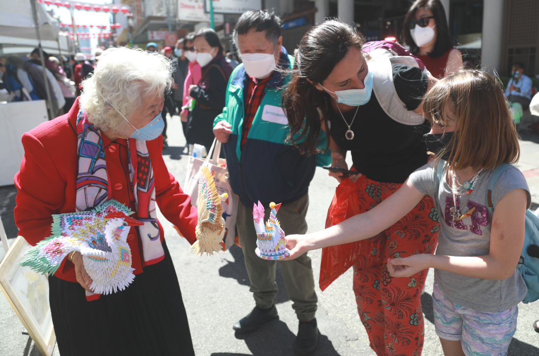 11日,一名女孩(前右)在旧金山唐人街中秋街会上选购手工艺品。