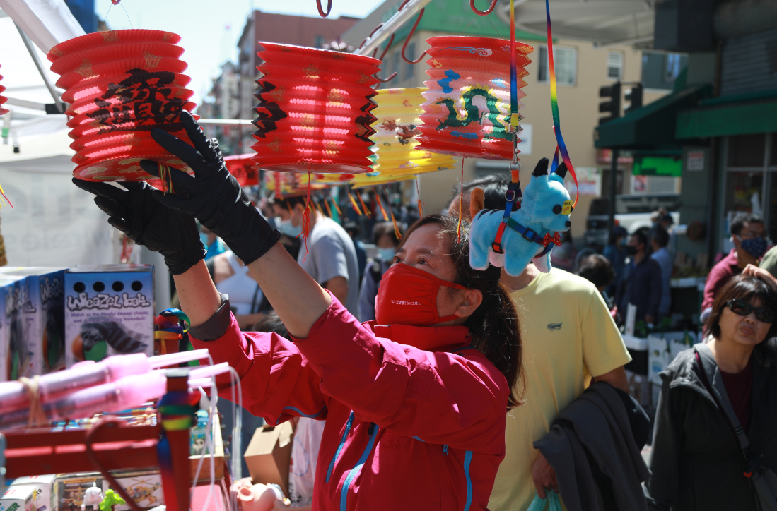 11日,一名女子在旧金山唐人街中秋街会上选购纸制花灯。