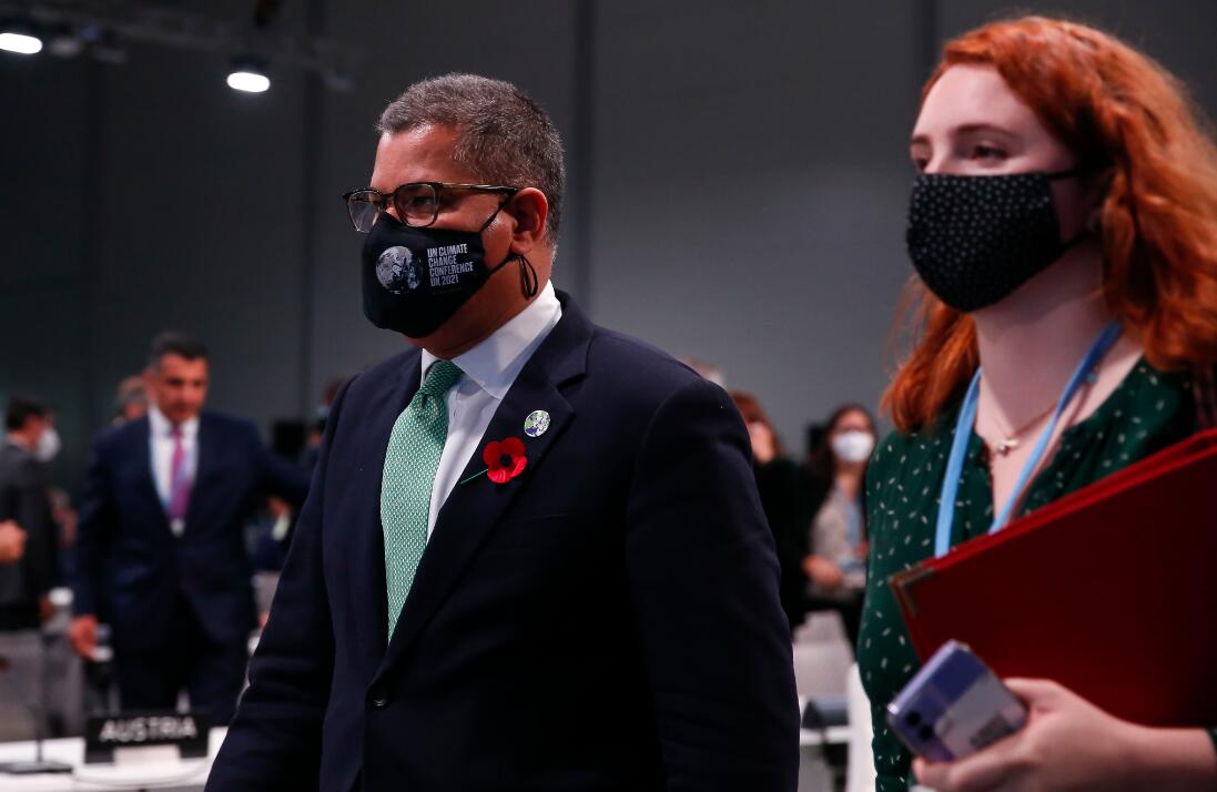11月1日,在英国格拉斯哥举行的《联合国气候变化框架公约》第26次缔约方大会世界领导人峰会上,大会主席夏尔马(前左)抵达开幕式现场。