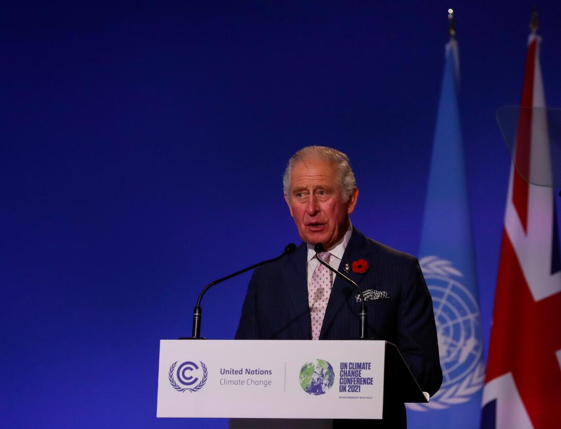 11月1日,英国王储查尔斯在英国格拉斯哥举行的《联合国气候变化框架公约》第26次缔约方大会世界领导人峰会开幕式上致辞。