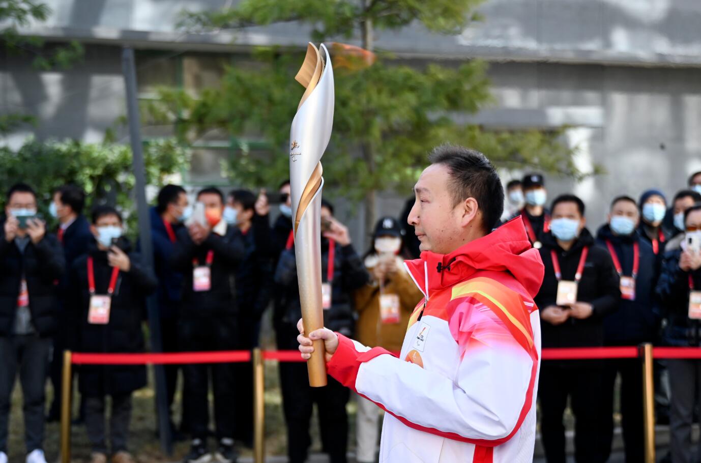 第一棒火炬手朱鹏凯在城市火种火炬传递中。(图片来源:中新社)