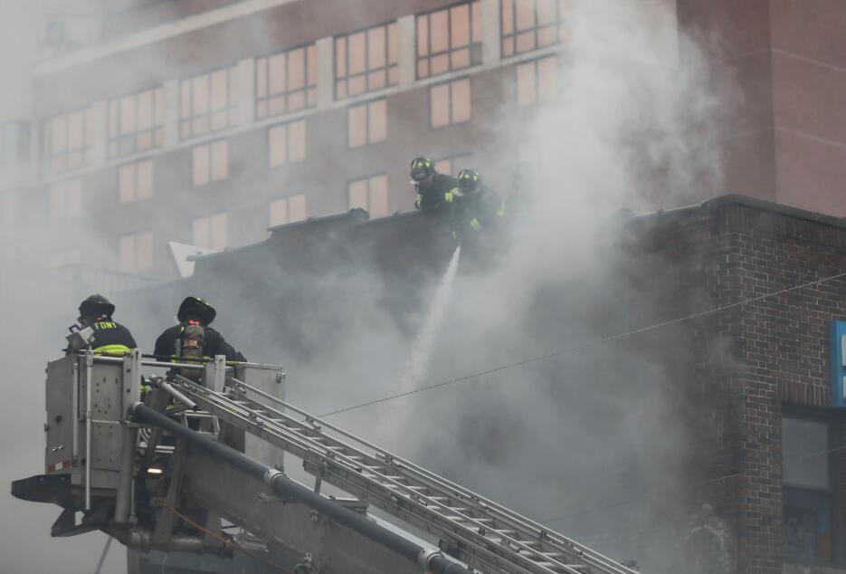 消防人员在法拉盛的火灾现场灭火,现场浓烟滚滚。(图片来源:新华社)