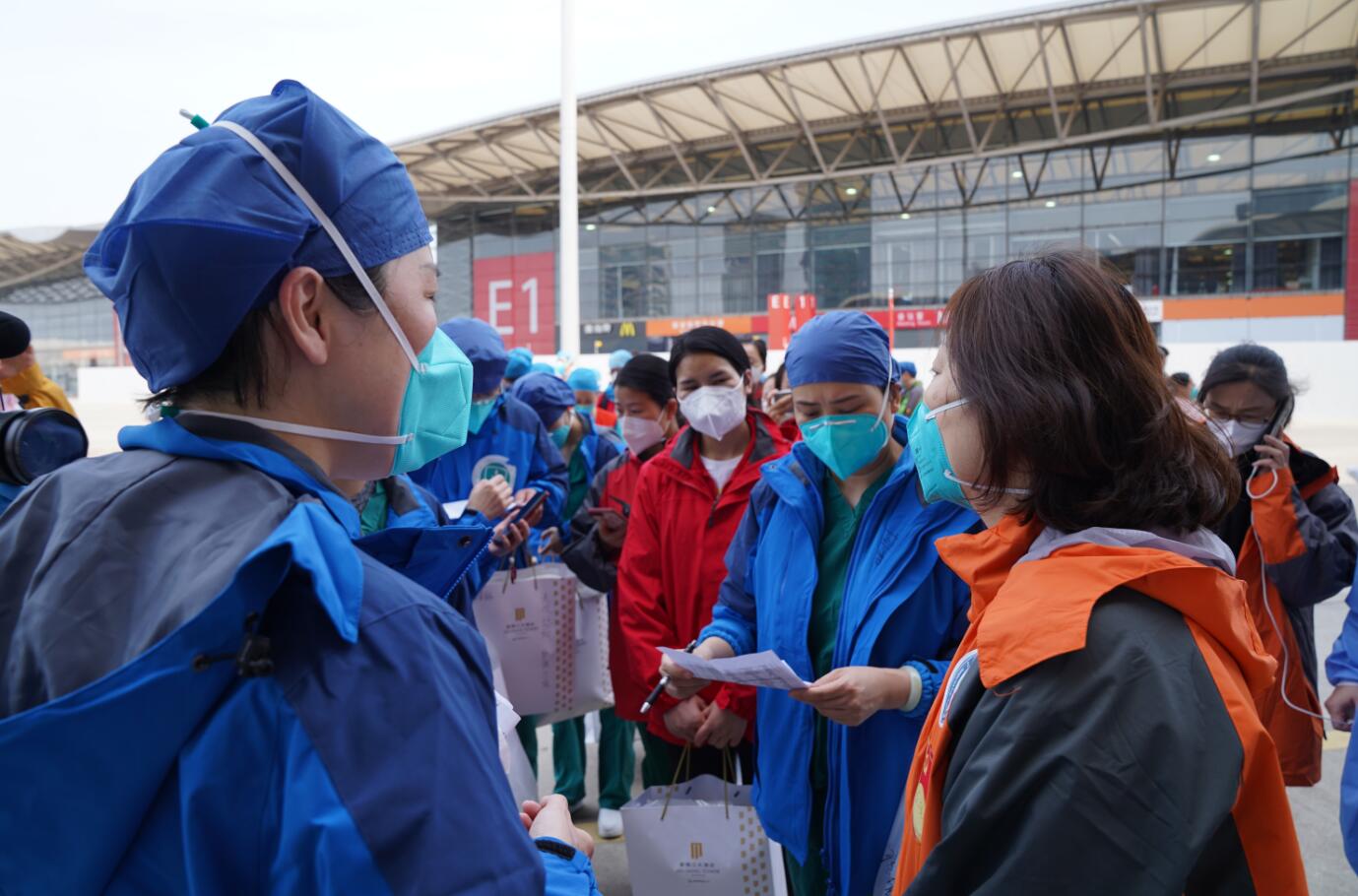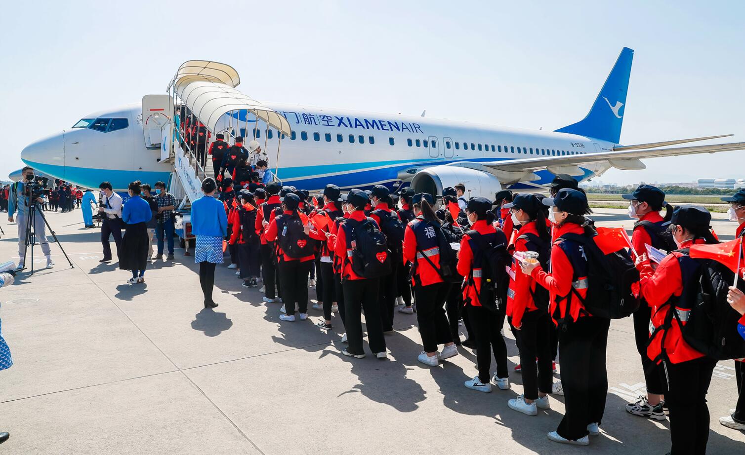 福建千余名医护人员7日启程驰援上海。图为福建援沪医疗队医护人员准备乘坐厦航班机前往上海支援当地疫情防控。(图片来源:中新社)