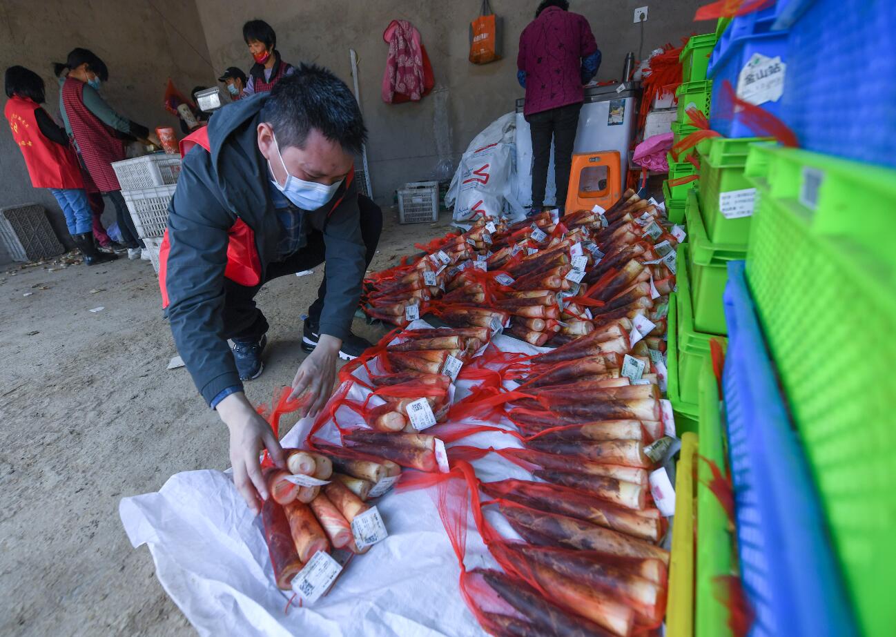 为保障上海市民的菜篮子,连日来,浙江省杭州市临安区太湖源镇组织志愿者和当地笋农一起分拣、打包竹笋,每天向上海发送3万斤左右的鲜笋。图为志愿者7日分拣、称重、打包竹笋。(图片来源:新华社)