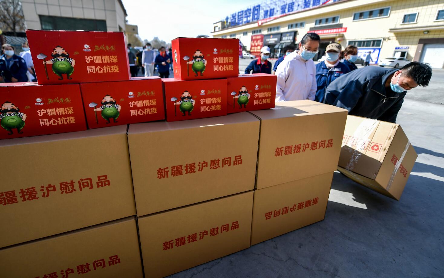 7日,新疆乌鲁木齐市高新北区工业园新疆果业集团生产基地等共同筹集的首批援沪抗疫物资,1.6万份新疆特色干果盒装车出发。(图片来源:中新社)