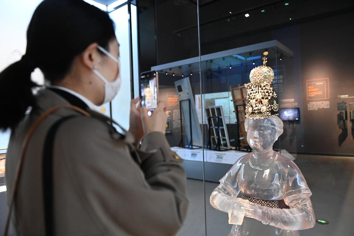 28日,游客在陕西考古博物馆内拍摄唐代李倕冠饰。