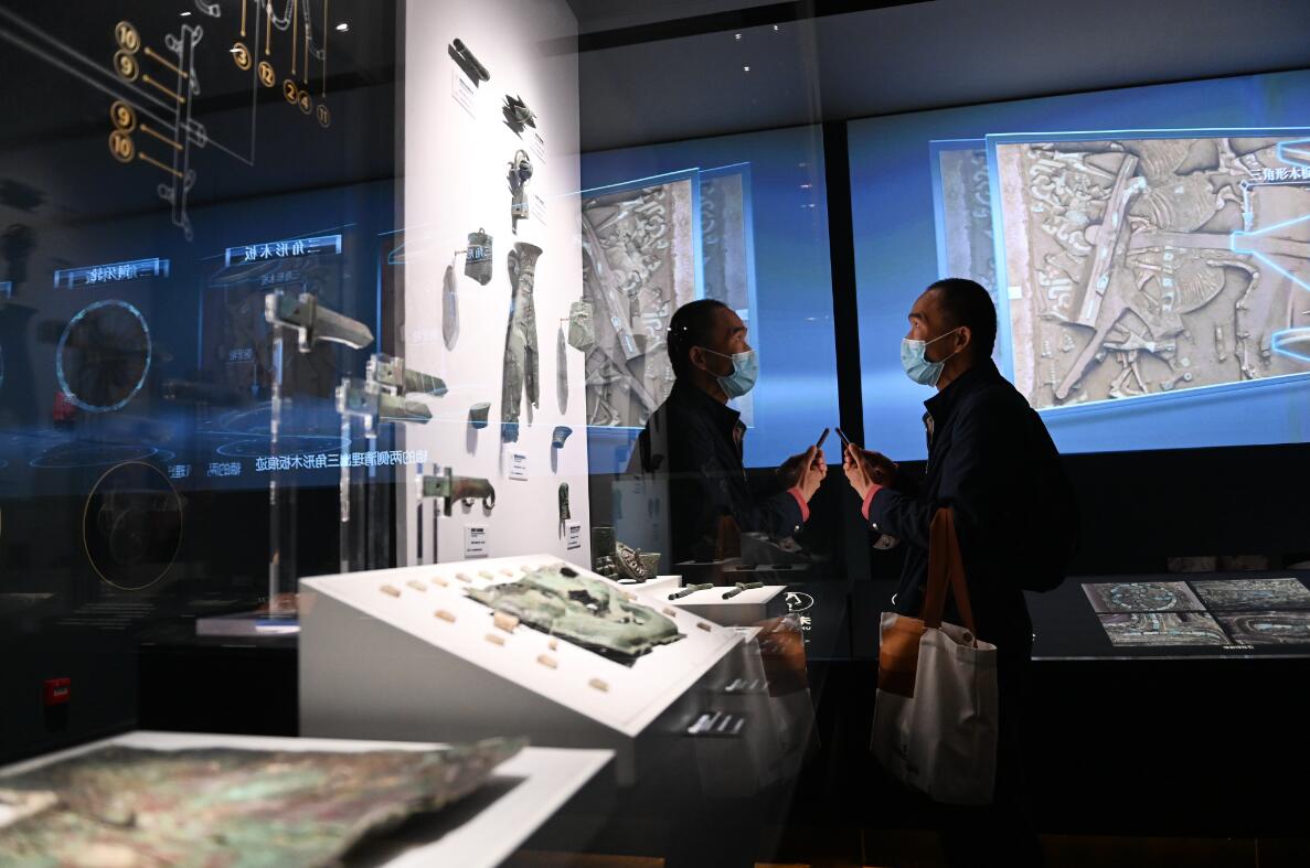 28日,游客在陕西考古博物馆内参观宝鸡周原遗址出土的铜轮牙马车车饰。