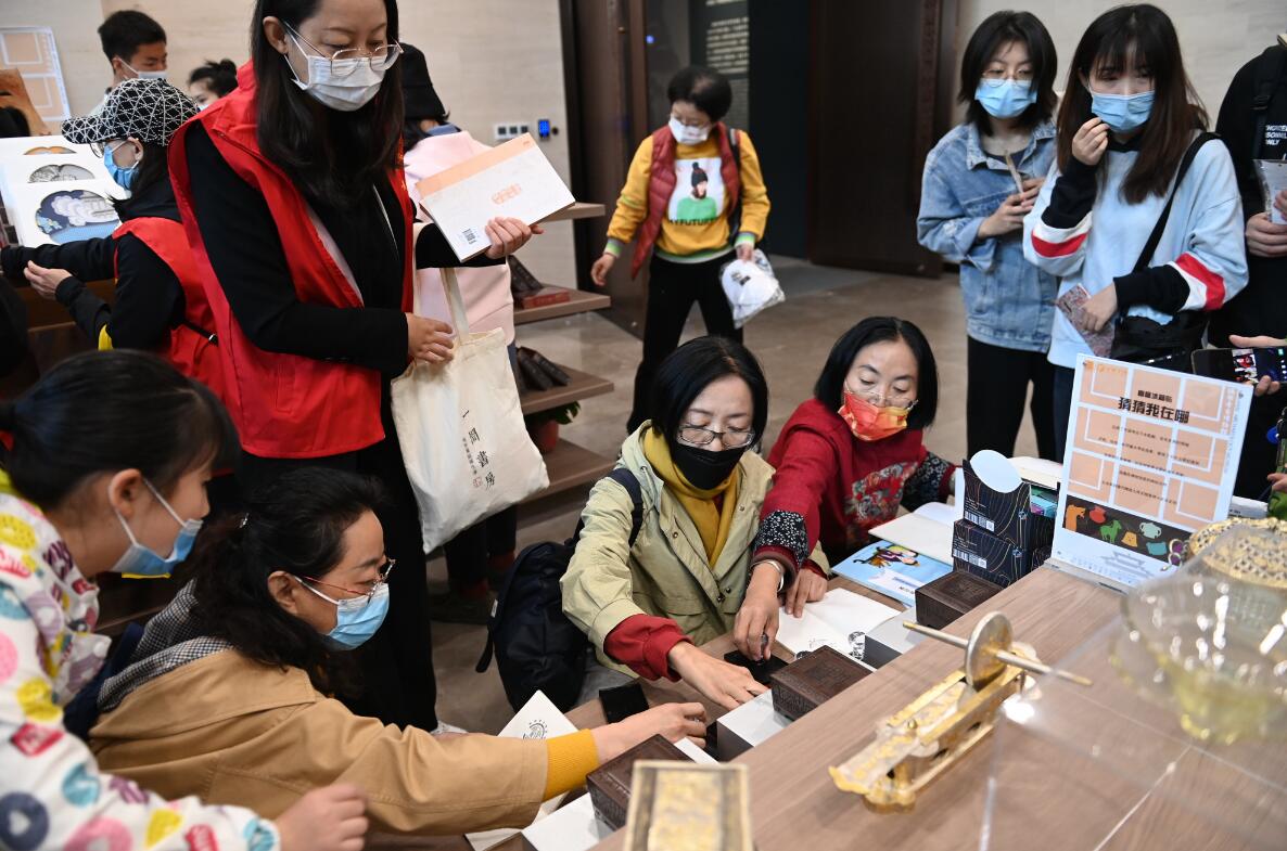 28日,游客在陕西考古博物馆内收集文创印章留念。