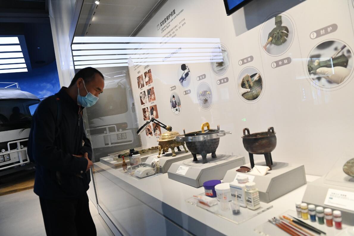 28日,游客在陕西考古博物馆内了解文物的实验室保护修复。