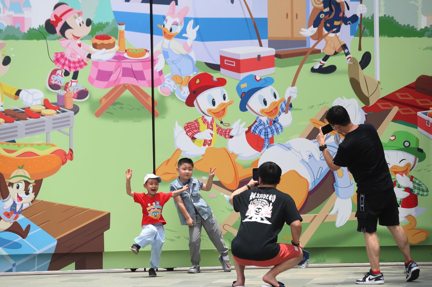 小朋友在迪士尼卡通墙前留影。