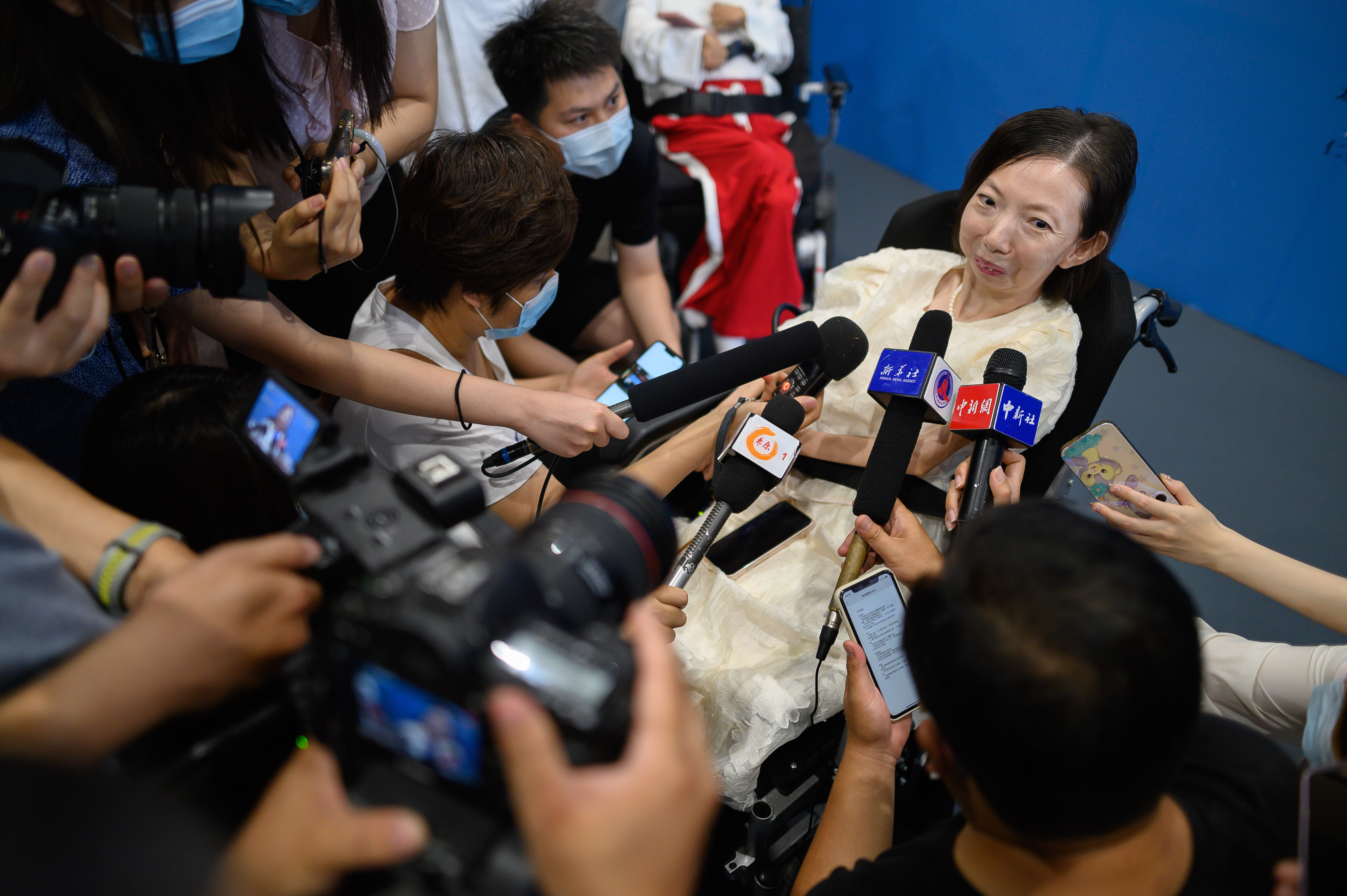 1978年出生的张俊莉6岁时罹患类风湿关节炎,8岁时全身85%的关节不能活动,卧病在床。10岁时,她用指缝夹笔,肩膀带动手臂绘画。1995年6月,张俊莉创作的漫画故事在《科幻大王》上发表,收到了人生第一笔稿费。后来,她还结识了另一位漫画作者余一梅。从笔友到亲密好友,余一梅一直鼓励着张俊莉在绘画道路上前行。图为7月26日,画展开幕后,张俊莉被媒体记者包围采访。