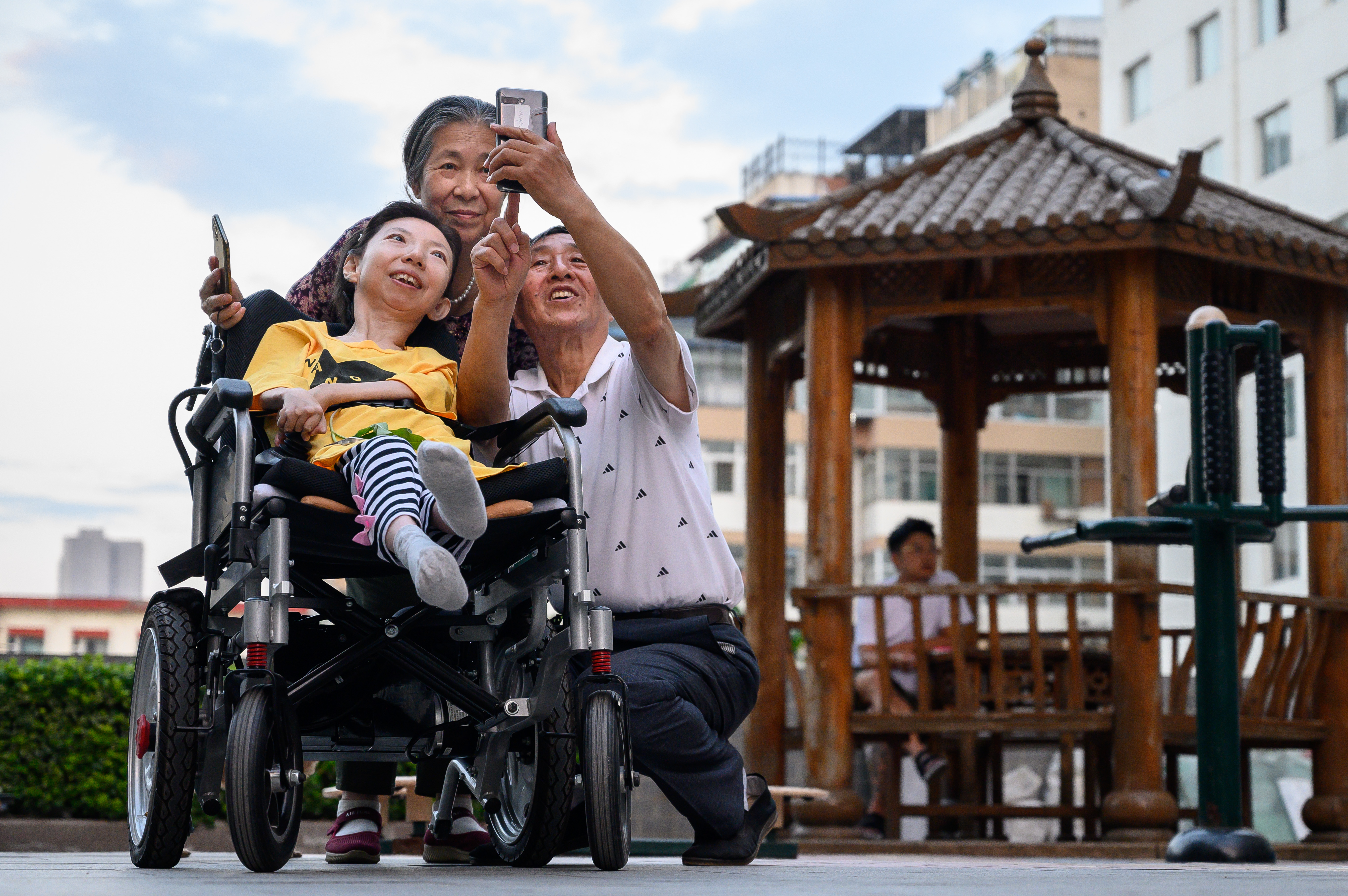 34年来,她躺在床上创作了300余幅绘画作品。近8年,她自学油画,功底越来越扎实,得到专业人士认可。图为7月20日,张俊莉的父母陪她在小区内散心,父亲拍摄夕阳美景,为张俊莉作画提供素材。