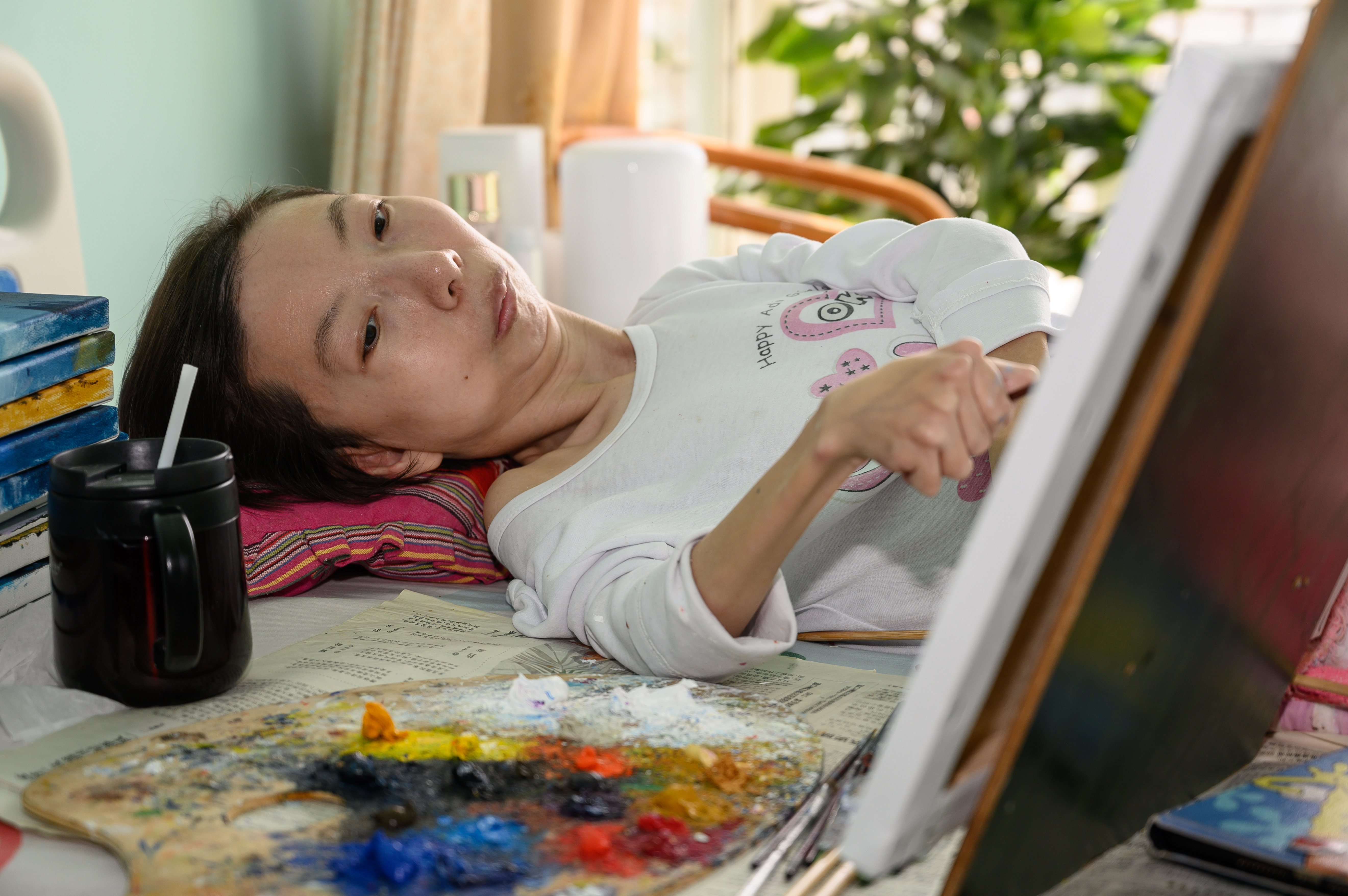看到张俊莉的进步,余一梅建议她把好作品留下来,为未来办画展积蓄力量。于是,办画展成为张俊莉心中的愿望。今年2月,张俊莉在快手“许愿池”活动中默默写下心愿,没抱希望的她被主办方幸运抽中,中国残疾人联合会与快手等单位要为她举办画展,张俊莉梦想成真。图为3月15日,张俊莉在家中床上创作油画。