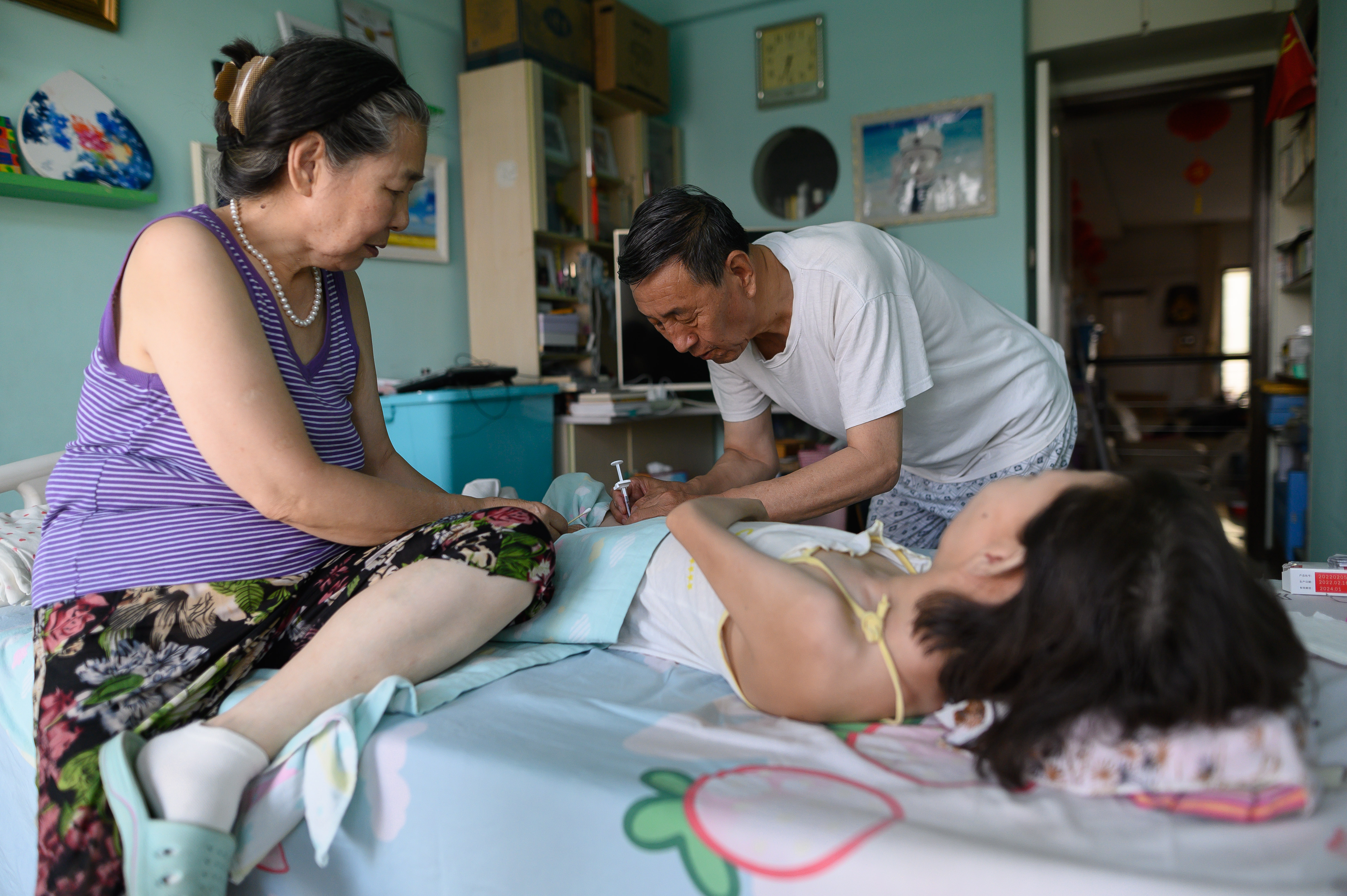 在等待画展开幕的日子里,张俊莉的妈妈说:“感觉好像在等待一场婚礼。”张俊莉也很感慨,她觉得对画家来说,举办第一场画展,就如同完成一件终身大事。“其实,画展意味着什么,我不大清楚,只是觉得这是好事,或许这是成为油画艺术家的必要经历。”图为7月23日,张俊莉的父亲在家中为女儿打针。为减轻女儿病痛,张爸爸自学打针,每周为女儿注射一次。