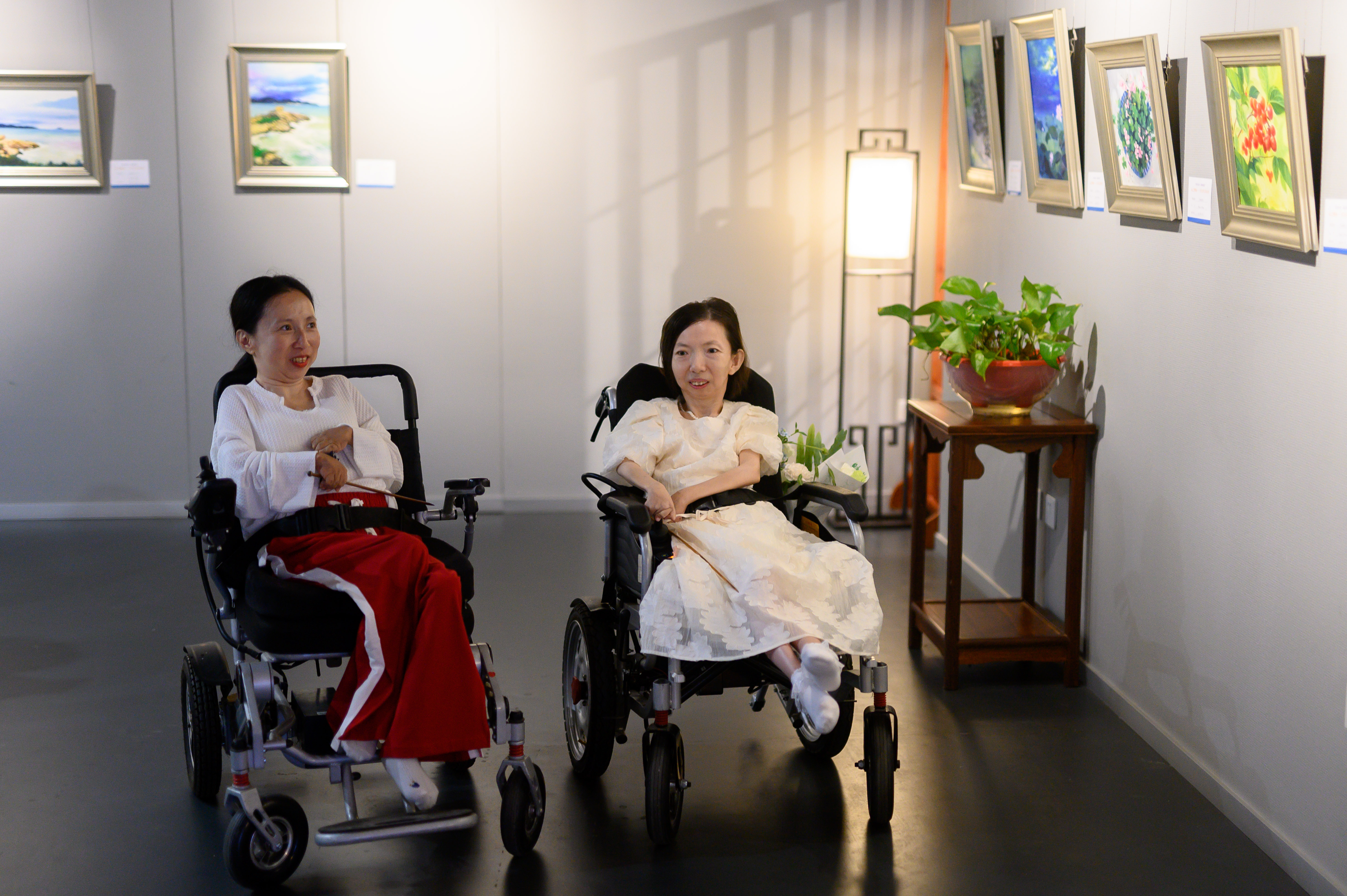 7月26日这天,上百人参观了张俊莉的画展,领略了这位瘫痪女子内心深处的星辰大海,感受了她不屈于命运的坚强人生。她的个人画展圆梦了,她的油画艺术家之梦才刚刚开始。图为7月26日,画展开幕后,张俊莉(右)与病友赵旭观看自己的油画展。