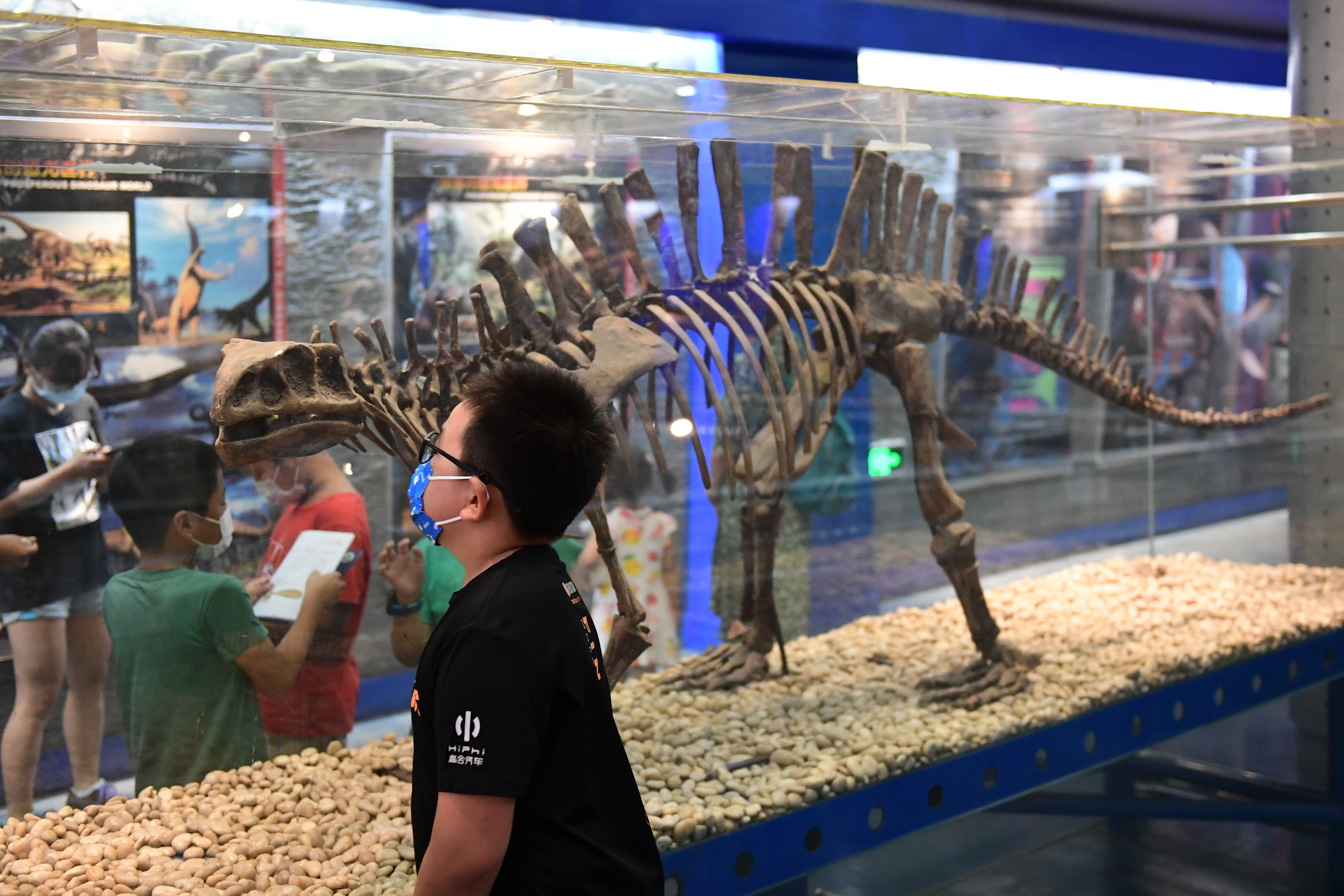 8月2日晚,小朋友在北京自然博物馆观看展出的无齿芙蓉龙化石。