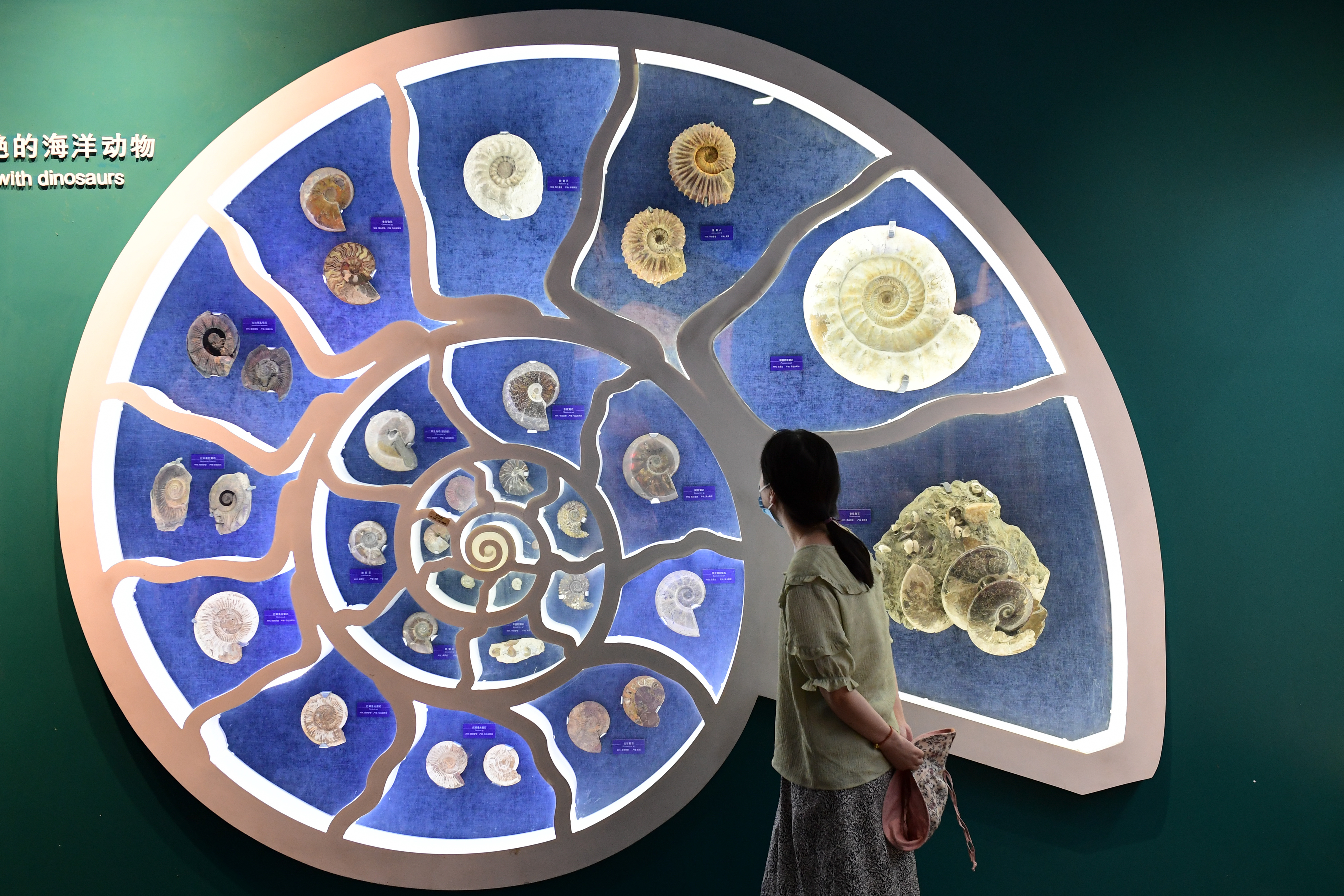 8月2日晚,参观者在北京自然博物馆观看展出的菊石。