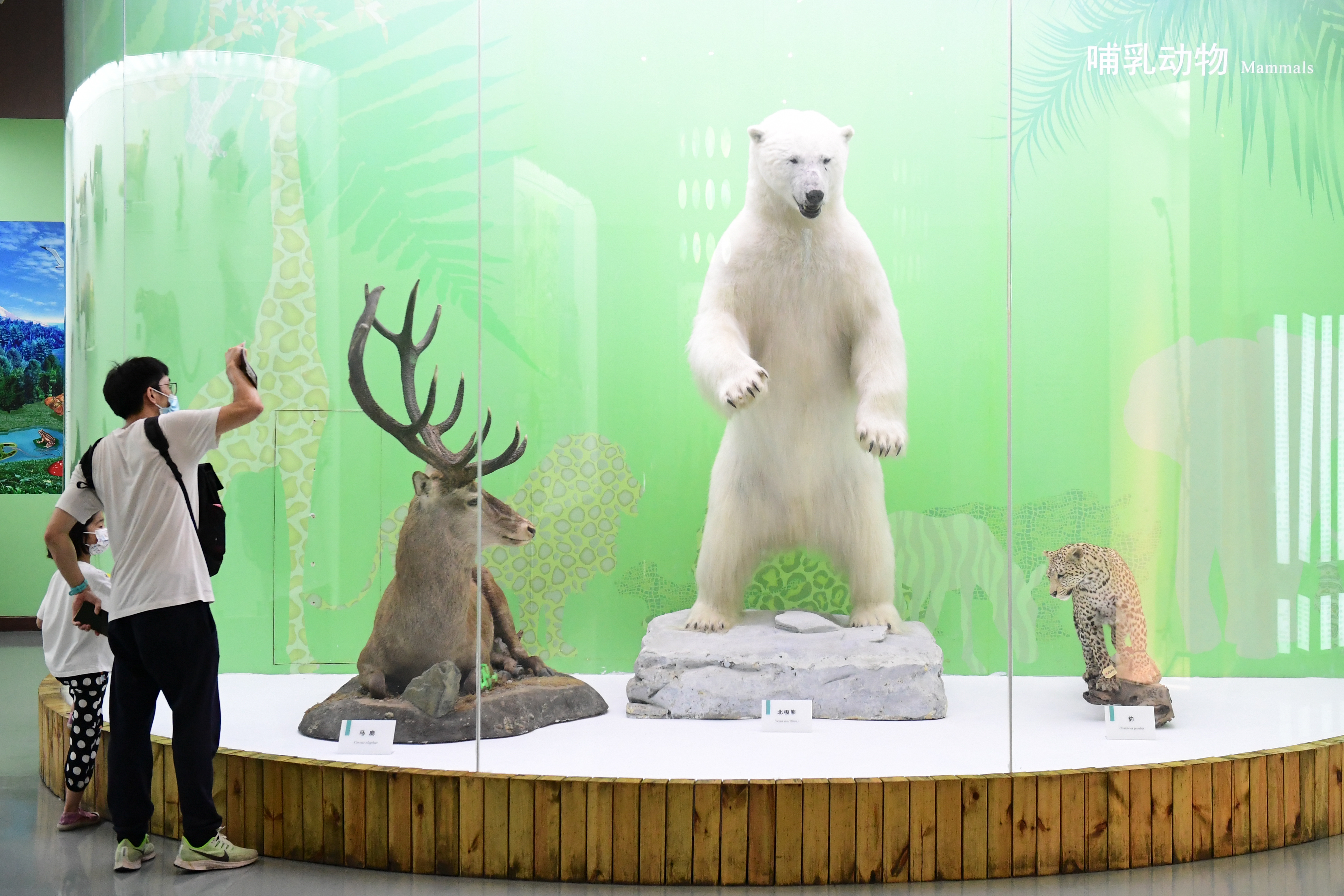 8月2日晚,家长带小朋友在北京自然博物馆观看展出的动物标本。