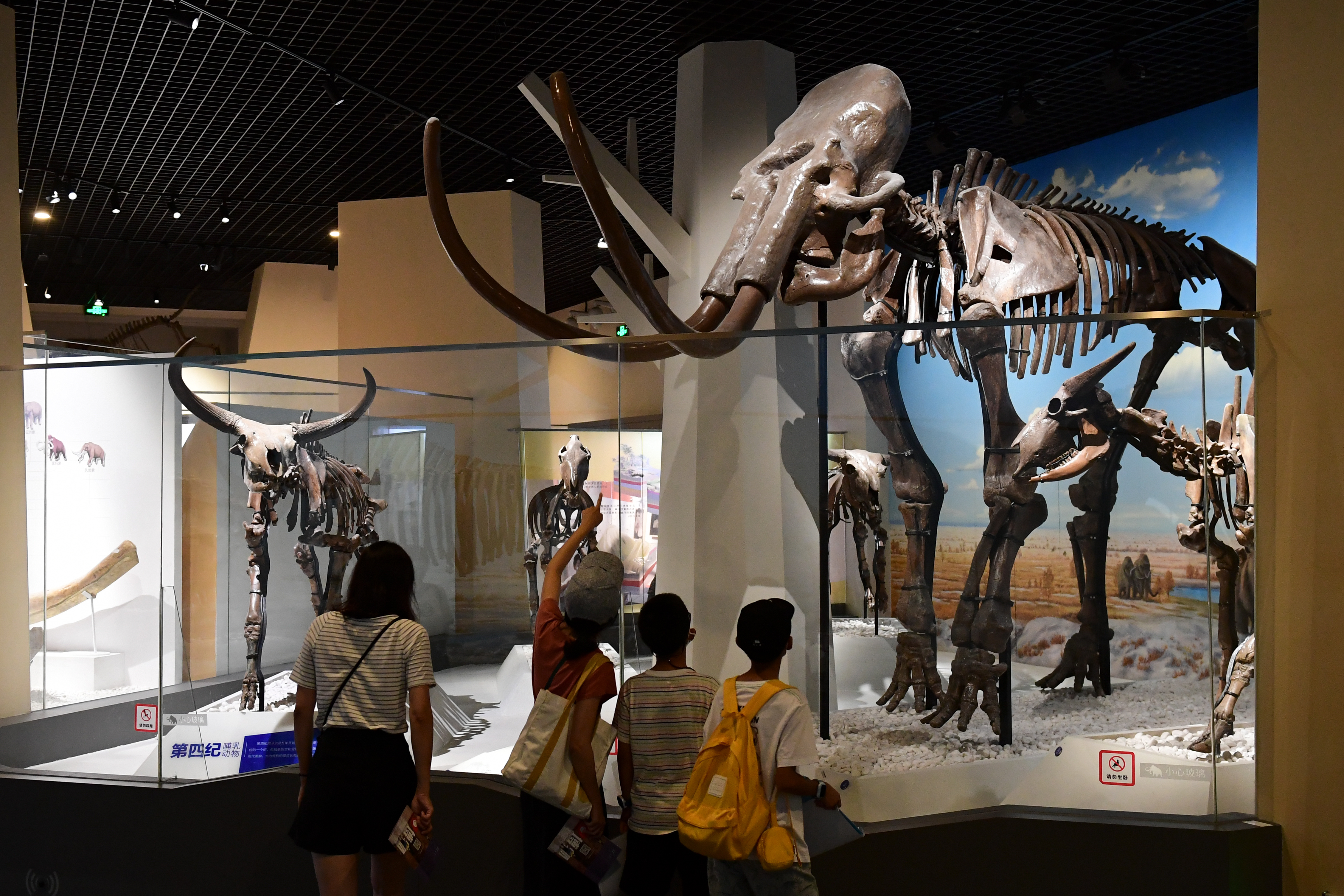 8月2日晚,家长带小朋友在北京自然博物馆观看展出的猛犸象化石。