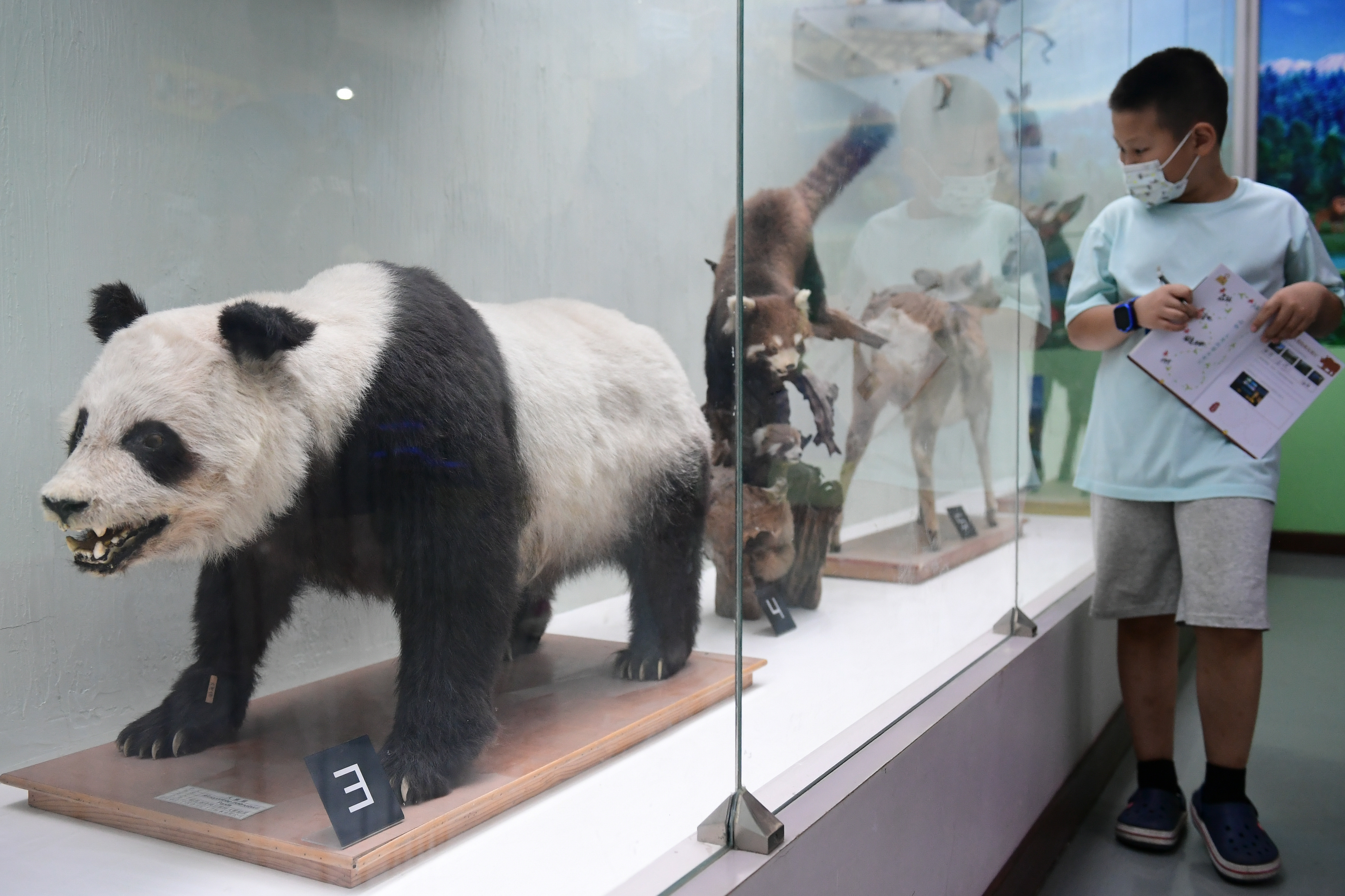 8月2日晚,小朋友在北京自然博物馆观看动物标本。