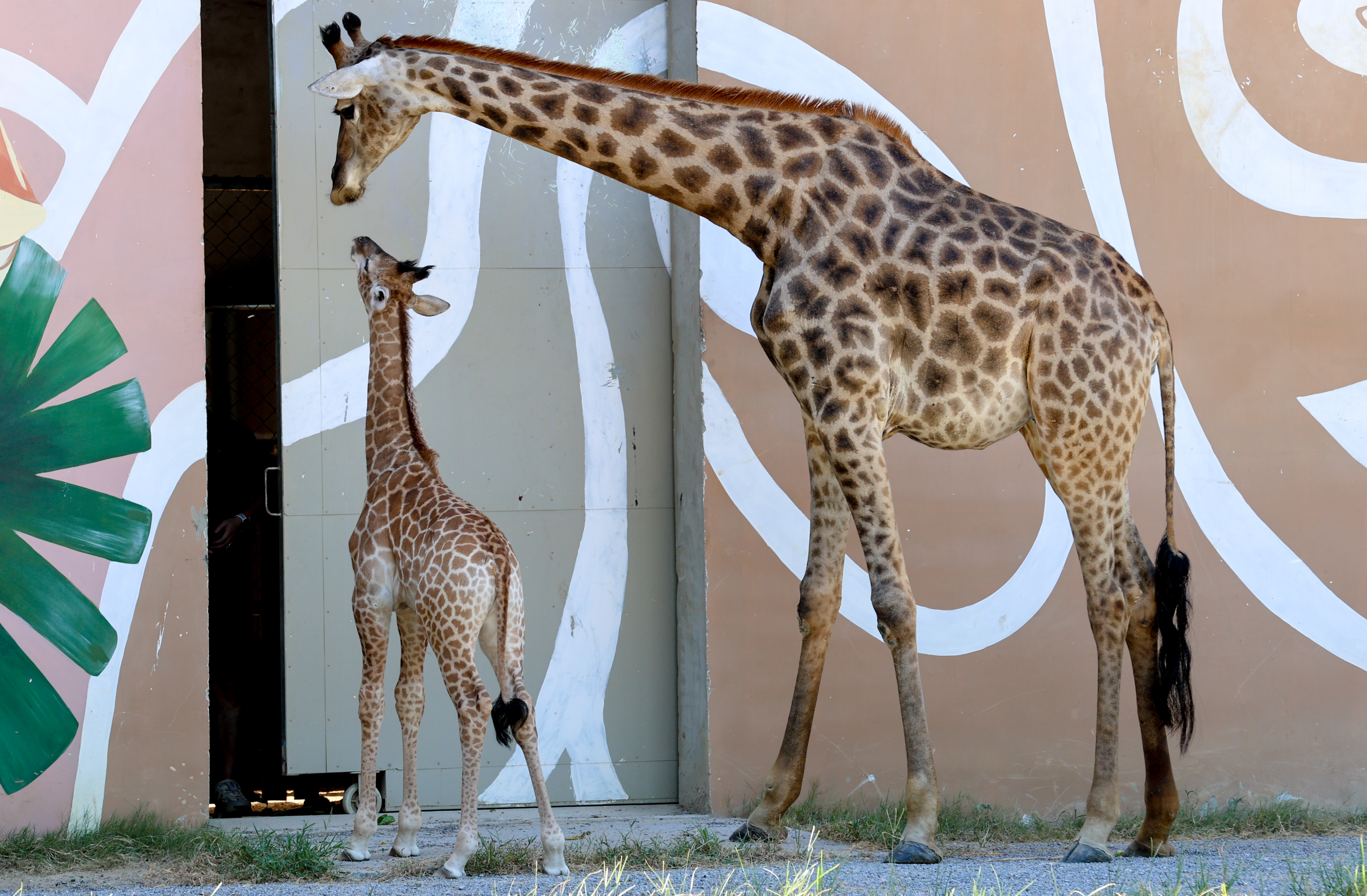 图为长颈鹿宝宝和妈妈在一起。