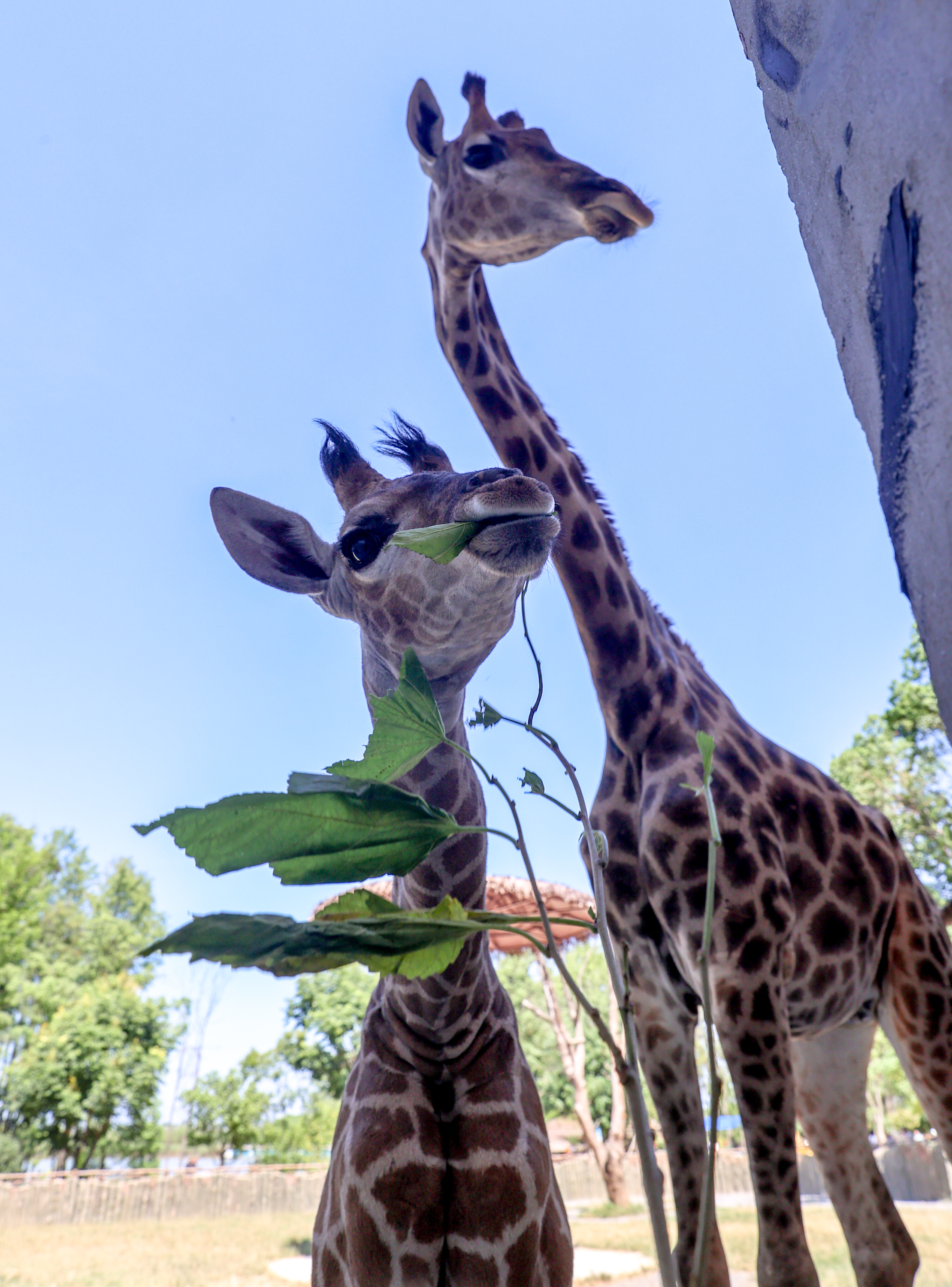图为长颈鹿宝宝和妈妈一起进食。