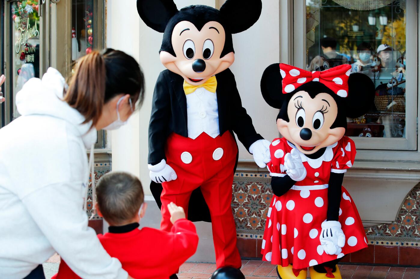 米奇、米妮25日在和游客互动。