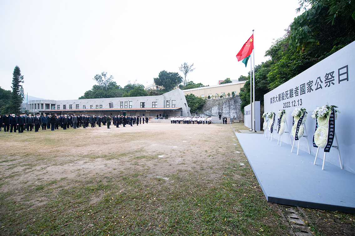 澳门13日举行公祭活动悼念南京大屠杀遇难同胞。图为出席公祭日仪式的各界人士默哀。(图片来源:新华社)