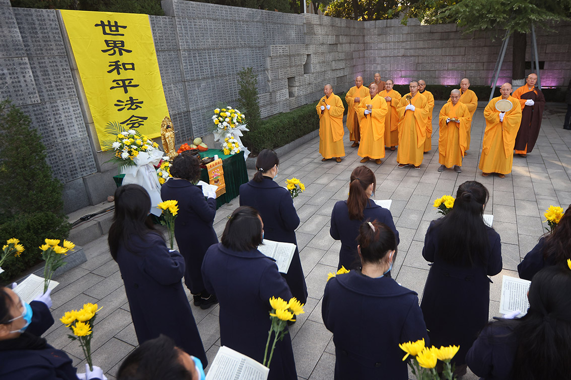 13日,“世界和平法会”在侵华日军南京大屠杀遇难同胞纪念馆遇难者名单墙前举行,祭奠南京大屠杀死难者,祈愿和平。(图片来源:中新社)