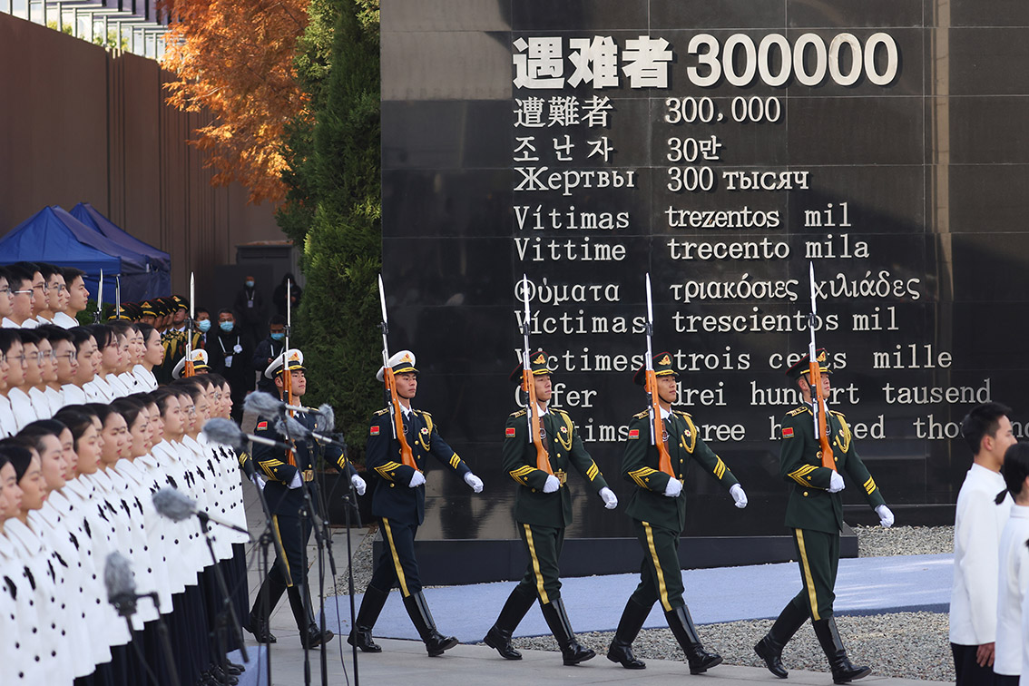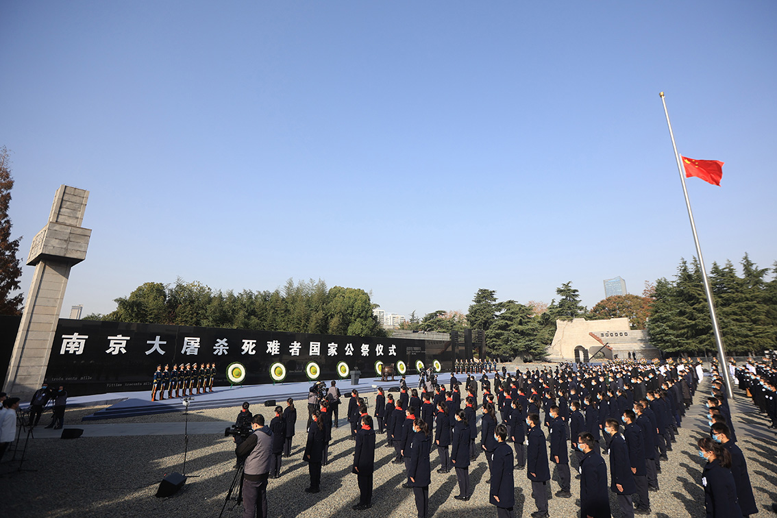 侵华日军南京大屠杀遇难同胞纪念馆举行升国旗、下半旗仪式。(图片来源:中新社)